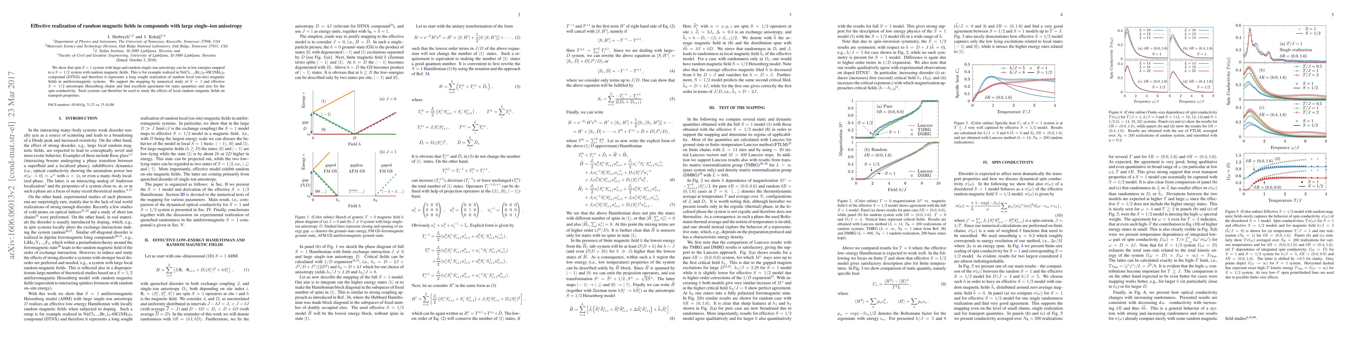 We show that spin $S=1$ system with large and random single--ion anisotropy can be at low energies mapped to a $S=1/2$ system with random magnetic fields. This is for example realized in \mbox{Ni(Cl$_{1-x}$Br$_{x}$)$_2$-4SC(NH$_2$)$_2$} compound (DTNX) and therefore it represents a long sought realization of random local (on-site) magnetic fields in antiferromagnetic systems. We support the mapping by numerical study of $S=1$ and effective $S=1/2$ anisotropic Heisenberg chains and find excellent agreement for static quantities and also for the spin conductivity. Such systems can therefore be used to study the effects of local random magnetic fields on transport properties.