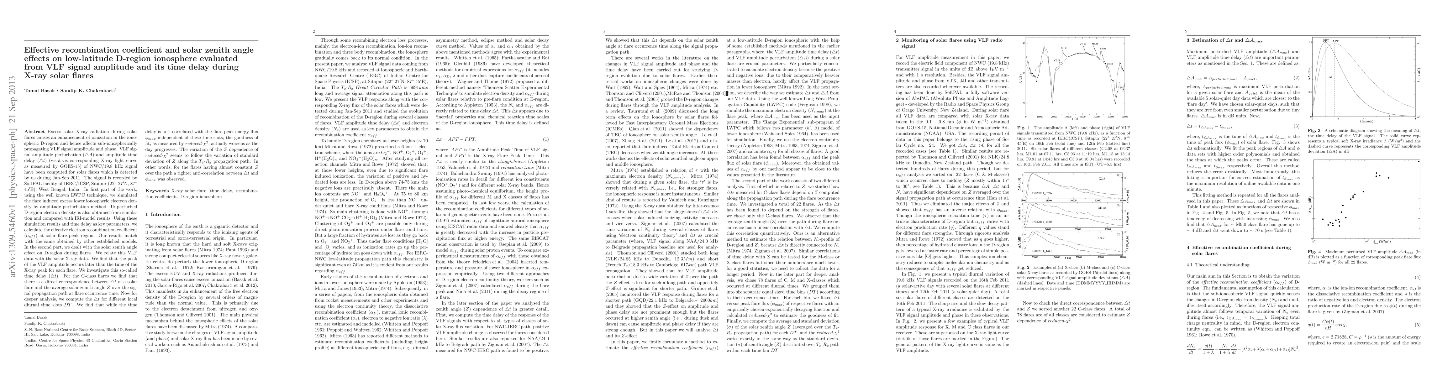 This paper investigates the impact of solar X-ray flares on the low-latitude D-region ionosphere using VLF signal amplitude and time delay. It calculates the effective recombination coefficient and examines the solar zenith angle's effect on the VLF signal, finding a correlation between time delay and solar zenith angle for C-class flares.