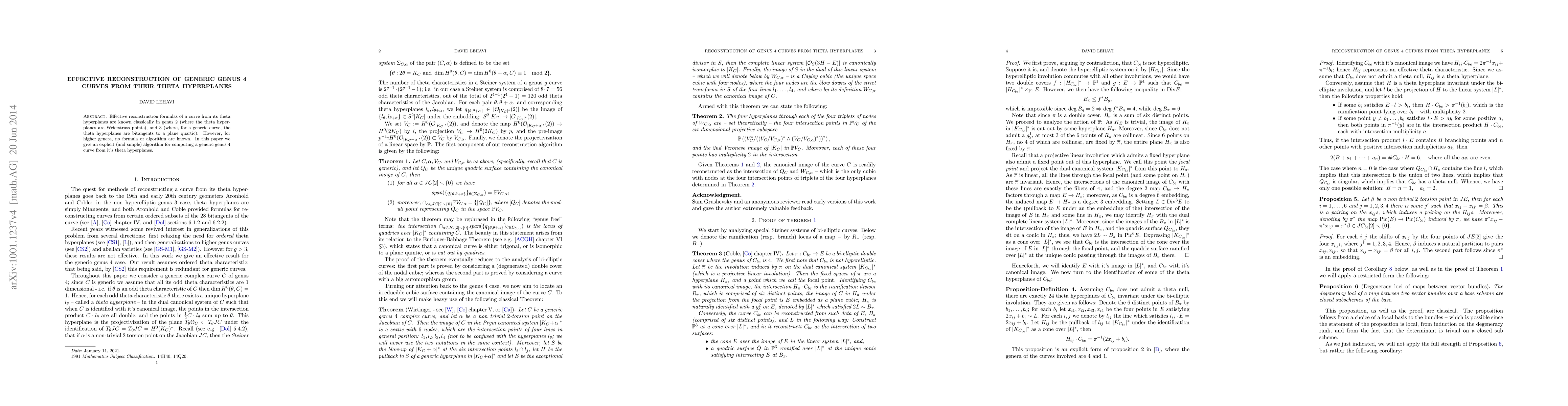 Effective reconstruction formulas of a curve from its theta hyperplanes are known classically in genus 2 (where the theta hyperplanes are Weierstrass points), and 3 (where, for a generic curve, the theta hyperplanes are bitangents to a plane quartic). However, for higher genera, no formula or algorithm are known. In this paper we give an explicit (and simple) algorithm for computing a generic genus 4 curve from it's theta hyperplanes.