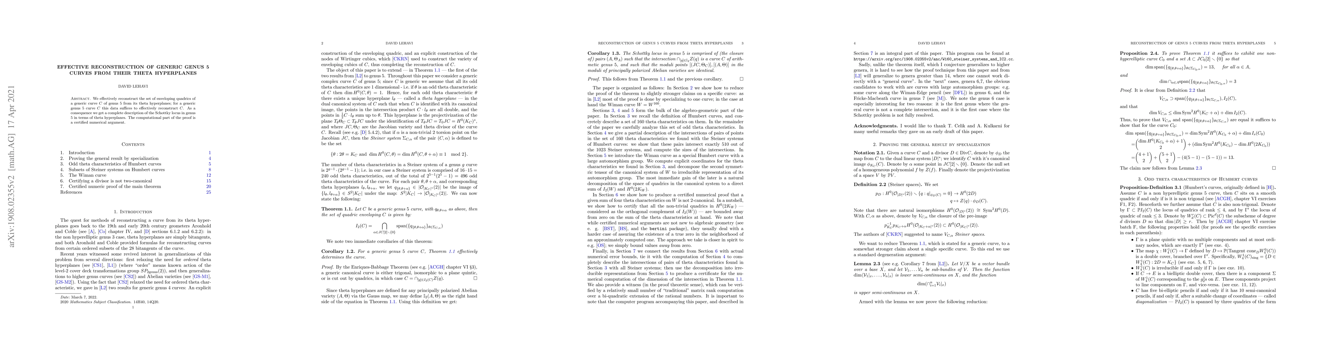 This paper reconstructs generic genus 5 curves from their theta hyperplanes by analyzing the enveloping quadrics, providing a complete description of the Schottky locus in genus 5 using this method, and employs certified numerical arguments for computational verification.