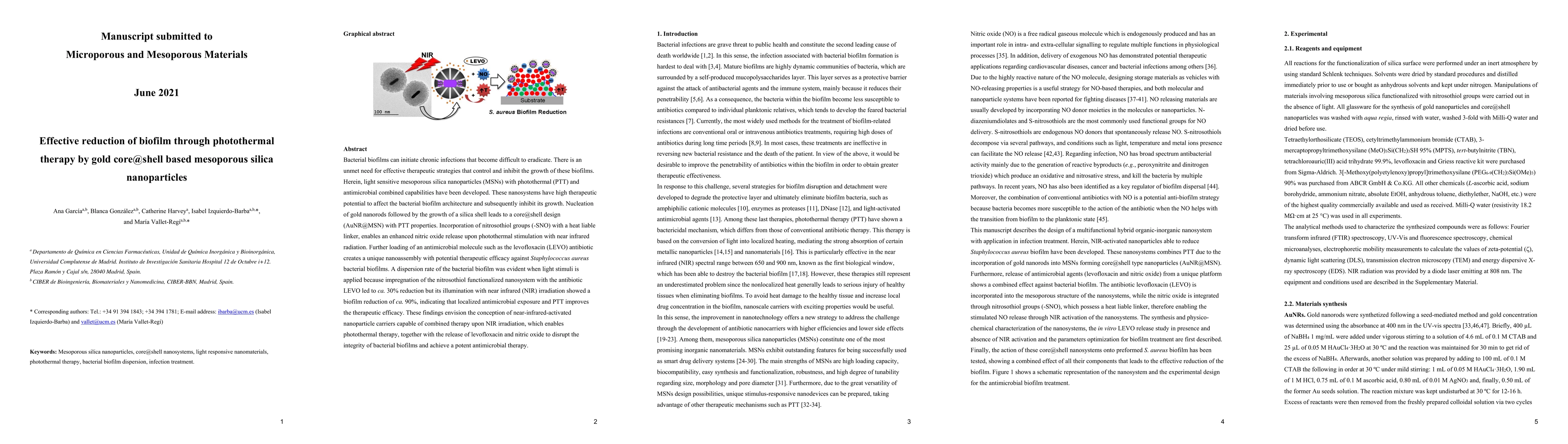 This paper presents gold core@shell based mesoporous silica nanoparticles (AuNR@MSN) for effective photothermal therapy to reduce bacterial biofilms. The nanoparticles, functionalized with nitrosothiol groups and loaded with levofloxacin, achieve a 90% reduction in biofilm upon near-infrared irradiation, demonstrating enhanced therapeutic efficacy through combined photothermal and antimicrobial action.