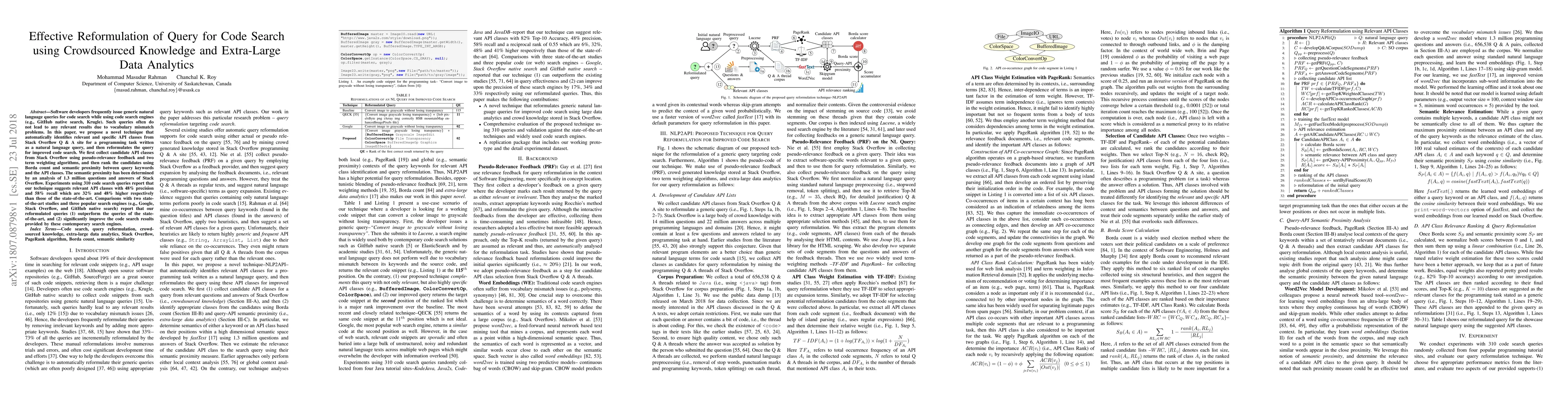 This paper introduces a technique that automatically refines generic code search queries using Stack Overflow data and large-scale analytics, improving relevance by 32%-48% compared to existing methods and outperforming popular search engines like Google, Stack Overflow, and GitHub native search.