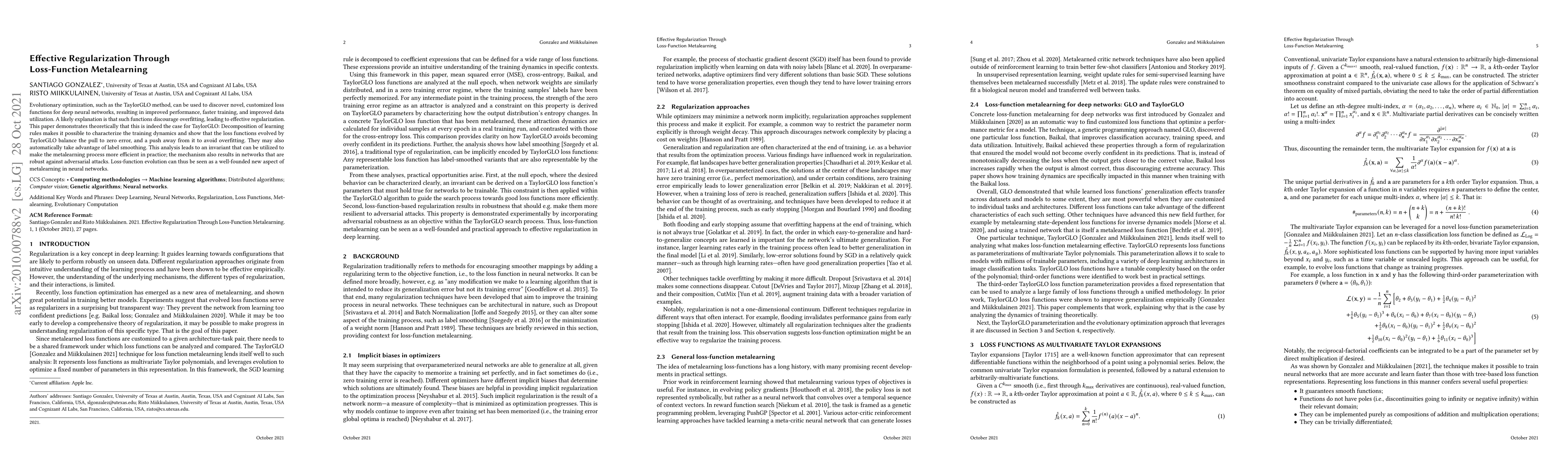 Evolutionary optimization, such as the TaylorGLO method, can be used to discover novel, customized loss functions for deep neural networks, resulting in improved performance, faster training, and improved data utilization. A likely explanation is that such functions discourage overfitting, leading to effective regularization. This paper demonstrates theoretically that this is indeed the case for TaylorGLO: Decomposition of learning rules makes it possible to characterize the training dynamics and show that the loss functions evolved by TaylorGLO balance the pull to zero error, and a push away from it to avoid overfitting. They may also automatically take advantage of label smoothing. This analysis leads to an invariant that can be utilized to make the metalearning process more efficient in practice; the mechanism also results in networks that are robust against adversarial attacks. Loss-function evolution can thus be seen as a well-founded new aspect of metalearning in neural networks.