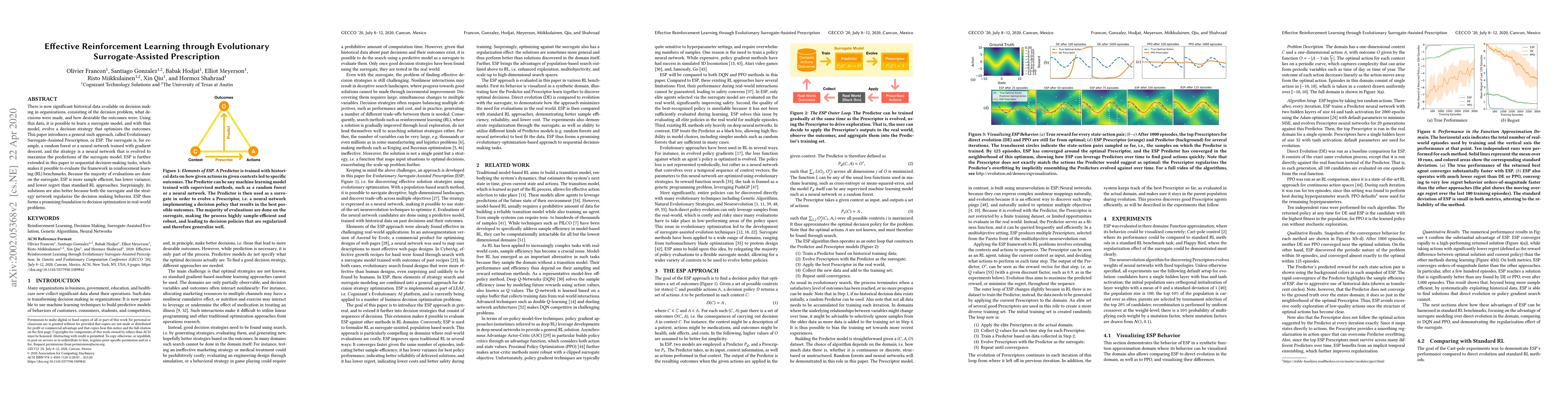 There is now significant historical data available on decision making in organizations, consisting of the decision problem, what decisions were made, and how desirable the outcomes were. Using this data, it is possible to learn a surrogate model, and with that model, evolve a decision strategy that optimizes the outcomes. This paper introduces a general such approach, called Evolutionary Surrogate-Assisted Prescription, or ESP. The surrogate is, for example, a random forest or a neural network trained with gradient descent, and the strategy is a neural network that is evolved to maximize the predictions of the surrogate model. ESP is further extended in this paper to sequential decision-making tasks, which makes it possible to evaluate the framework in reinforcement learning (RL) benchmarks. Because the majority of evaluations are done on the surrogate, ESP is more sample efficient, has lower variance, and lower regret than standard RL approaches. Surprisingly, its solutions are also better because both the surrogate and the strategy network regularize the decision-making behavior. ESP thus forms a promising foundation to decision optimization in real-world problems.