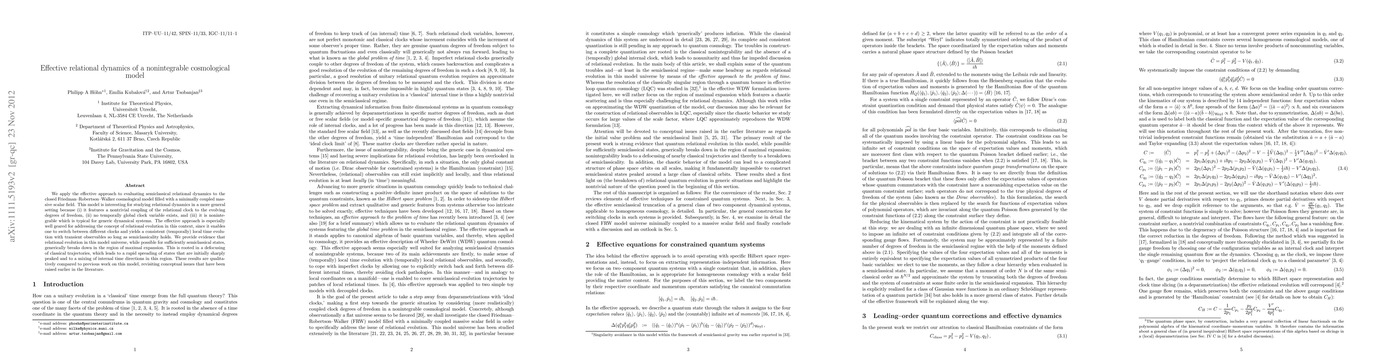 We apply the effective approach to evaluating semiclassical relational dynamics to the closed Friedman--Robertson--Walker cosmological model filled with a minimally coupled massive scalar field. This model is interesting for studying relational dynamics in a more general setting because (i) it features a nontrivial coupling of the relational clock to the evolving degrees of freedom, (ii) no temporally global clock variable exists, and (iii) it is nonintegrable which is typical for generic dynamical systems. The effective approach is especially well geared for addressing the concept of relational evolution in this context, since it enables one to switch between different clocks and yields a consistent (temporally) local time evolution with transient observables so long as semiclassicality holds. We provide evidence that relational evolution in this model universe, while possible for sufficiently semiclassical states, generically breaks down in the region of maximal expansion. This is rooted in a defocusing of classical trajectories, which leads to a rapid spreading of states that are initially sharply peaked and to a mixing of internal time directions in this region. These results are qualitatively compared to previous work on this model, revisiting conceptual issues that have been raised earlier in the literature.