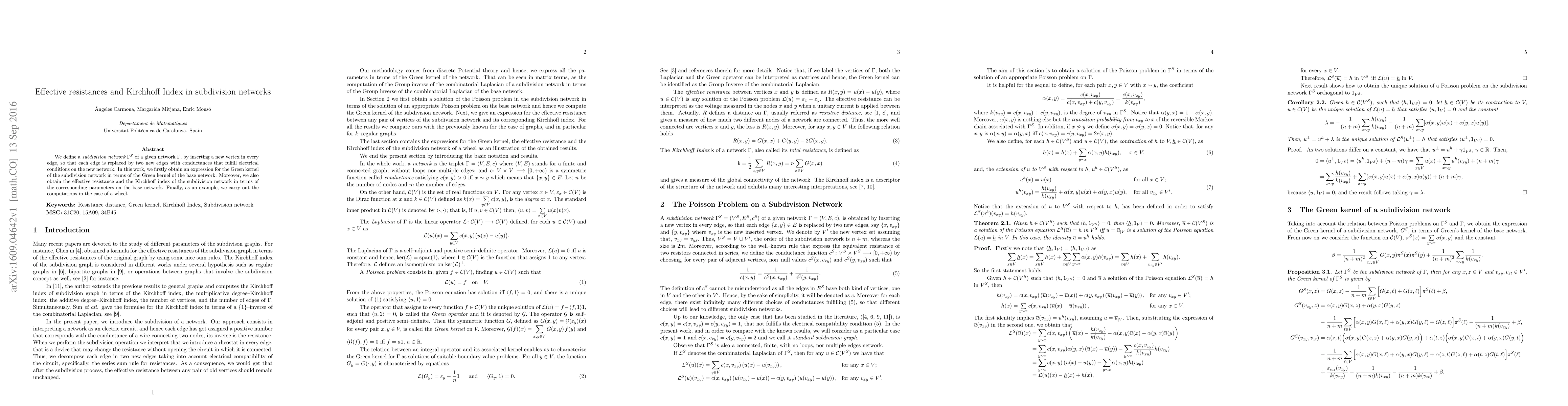 This paper derives expressions for the Green kernel, effective resistance, and Kirchhoff index of subdivision networks in terms of the base network's parameters, and applies these findings to compute these metrics for a wheel network.