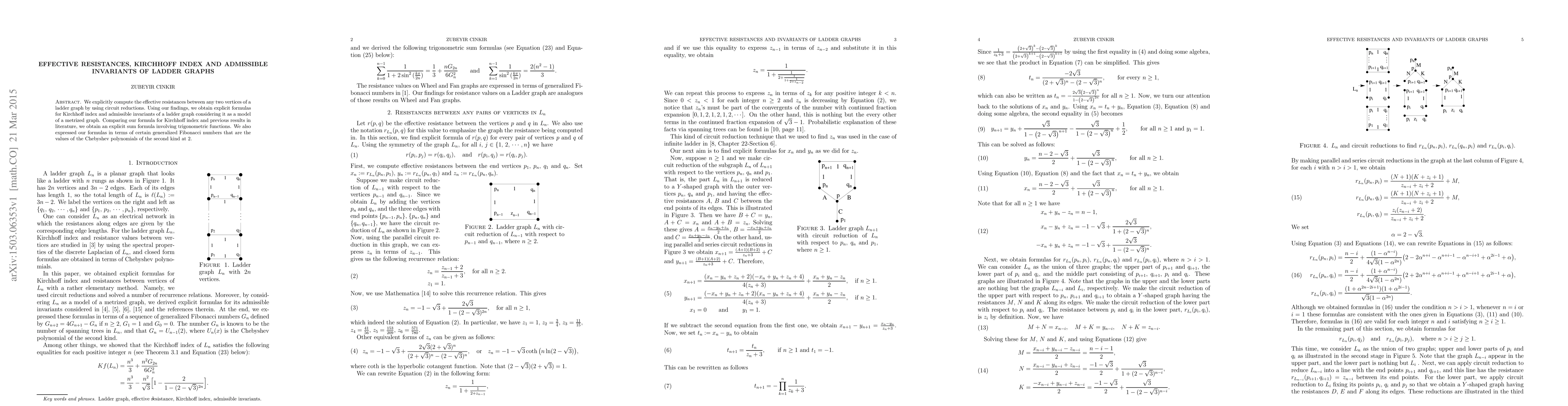 This paper computes effective resistances in ladder graphs via circuit reductions, deriving explicit formulas for the Kirchhoff index and admissible invariants. It presents a sum formula for the Kirchhoff index involving trigonometric functions and expresses results in terms of generalized Fibonacci numbers.