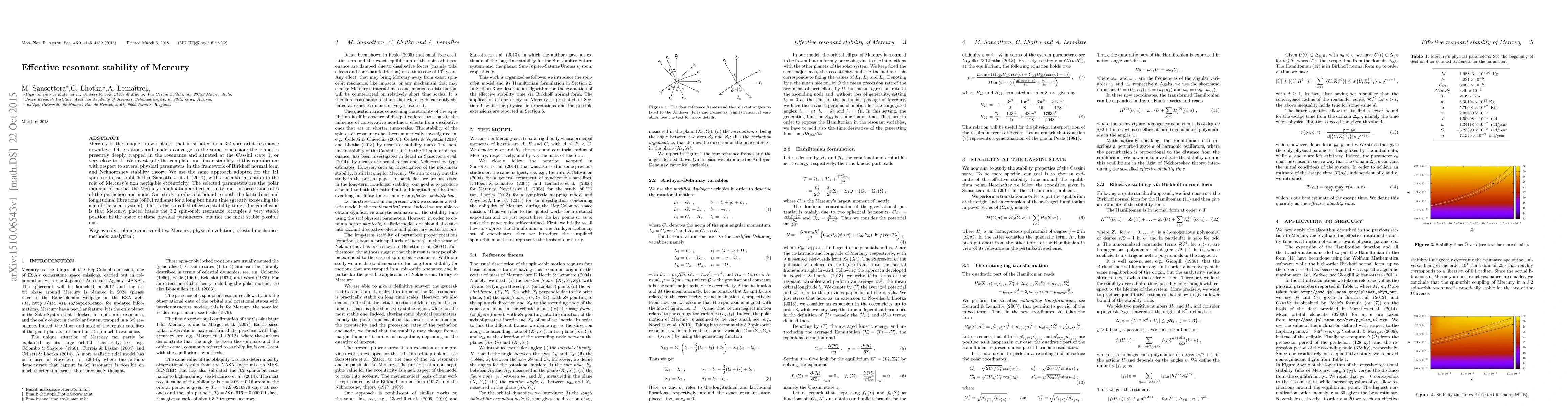 Mercury is the unique known planet that is situated in a 3:2 spin-orbit resonance nowadays. Observations and models converge to the same conclusion: the planet is presently deeply trapped in the resonance and situated at the Cassini state $1$, or very close to it. We investigate the complete non-linear stability of this equilibrium, with respect to several physical parameters, in the framework of Birkhoff normal form and Nekhoroshev stability theory. We use the same approach adopted for the 1:1 spin-orbit case with a peculiar attention to the role of Mercury's non negligible eccentricity. The selected parameters are the polar moment of inertia, the Mercury's inclination and eccentricity and the precession rates of the perihelion and node. Our study produces a bound to both the latitudinal and longitudinal librations (of 0.1 radians) for a long but finite time (greatly exceeding the age of the solar system). This is the so-called effective stability time. Our conclusion is that Mercury, placed inside the 3:2 spin-orbit resonance, occupies a very stable position in the space of these physical parameters, but not the most stable possible one.