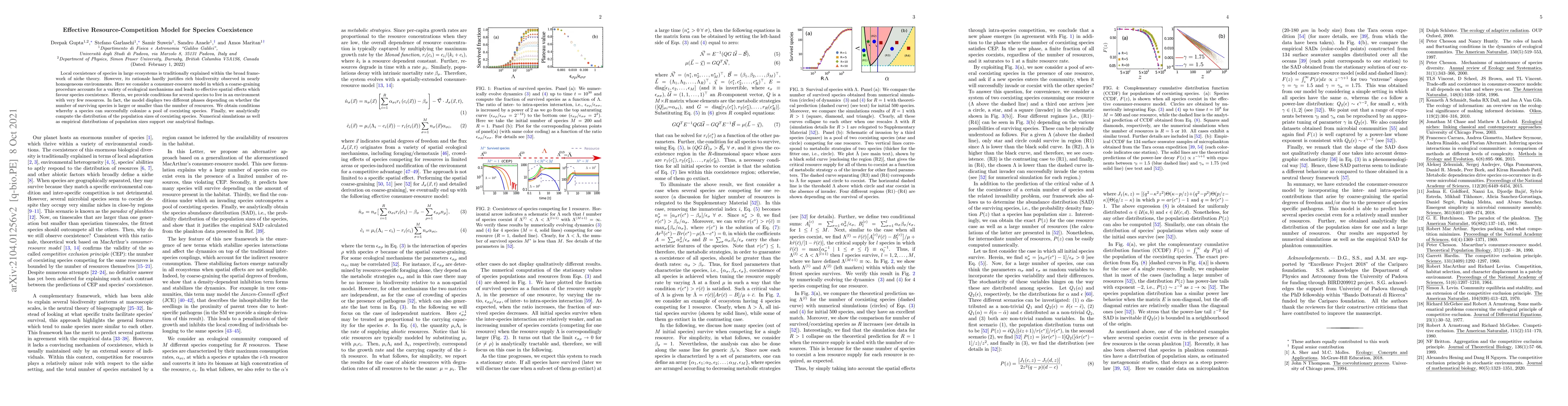 Local coexistence of species in large ecosystems is traditionally explained within the broad framework of niche theory. However, its rationale hardly justifies rich biodiversity observed in nearly homogeneous environments. Here we consider a consumer-resource model in which a coarse-graining procedure accounts for a variety of ecological mechanisms and leads to effective spatial effects which favour species coexistence. Herein, we provide conditions for several species to live in an environment with very few resources. In fact, the model displays two different phases depending on whether the number of surviving species is larger or smaller than the number of resources. We obtain conditions whereby a species can successfully colonize a pool of coexisting species. Finally, we analytically compute the distribution of the population sizes of coexisting species. Numerical simulations as well as empirical distributions of population sizes support our analytical findings.