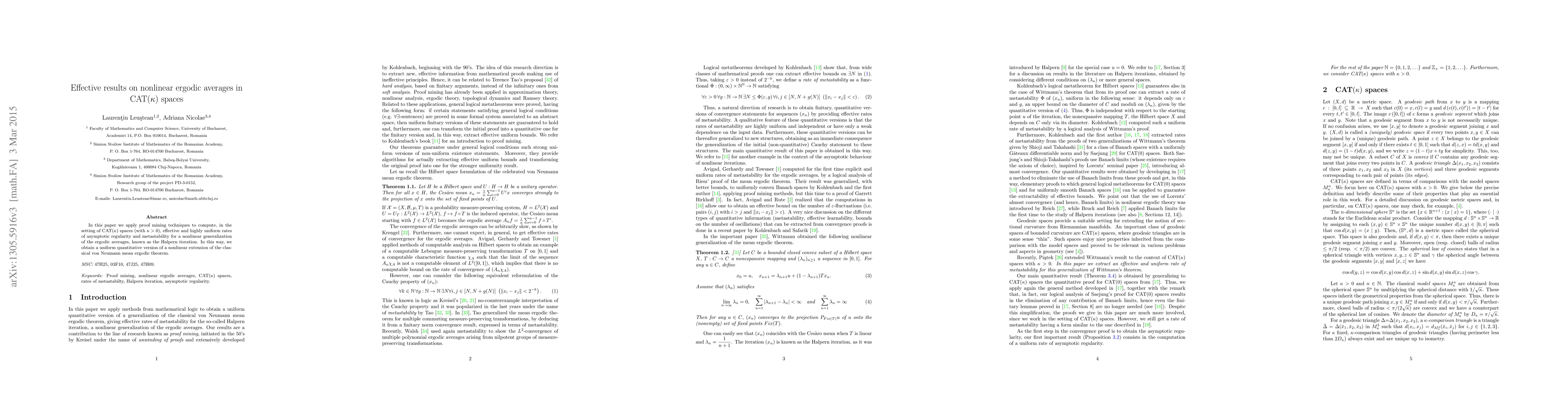 In this paper we apply proof mining techniques to compute, in the setting of CAT$(\kappa)$ spaces (with $\kappa >0$), effective and highly uniform rates of asymptotic regularity and metastability for a nonlinear generalization of the ergodic averages, known as the Halpern iteration. In this way, we obtain a uniform quantitative version of a nonlinear extension of the classical von Neumann mean ergodic theorem.