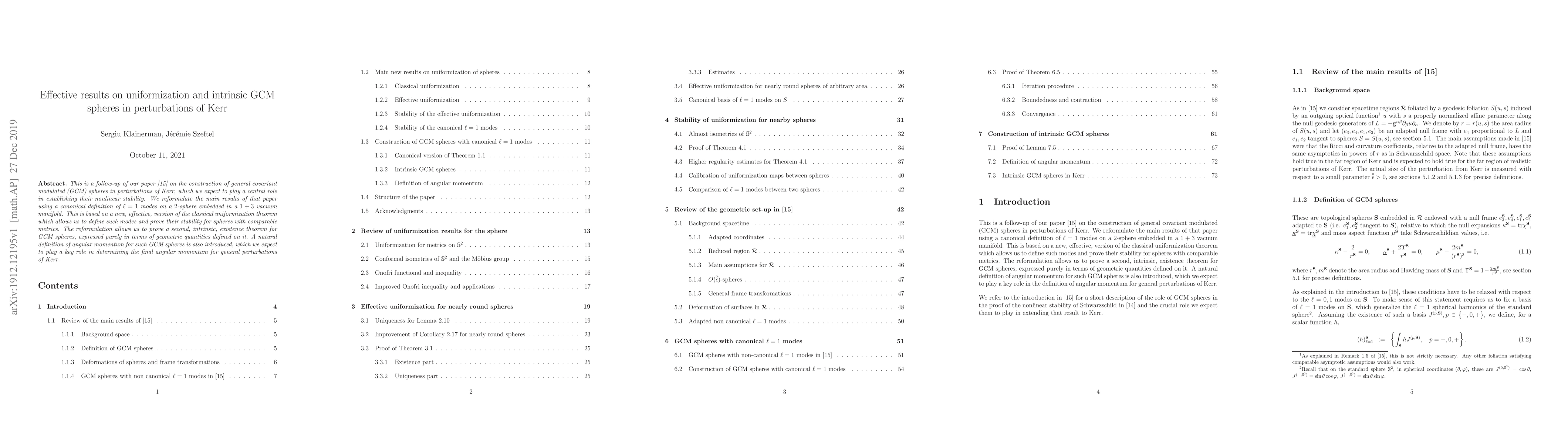 This is a follow-up of our paper \cite{KS-Kerr1} on the construction of general covariant modulated (GCM) spheres in perturbations of Kerr, which we expect to play a central role in establishing their nonlinear stability. We reformulate the main results of that paper using a canonical definition of $\ell=1$ modes on a $2$-sphere embedded in a $1+3$ vacuum manifold. This is based on a new, effective, version of the classical uniformization theorem which allows us to define such modes and prove their stability for spheres with comparable metrics. The reformulation allows us to prove a second, intrinsic, existence theorem for GCM spheres, expressed purely in terms of geometric quantities defined on it. A natural definition of angular momentum for such GCM spheres is also introduced, which we expect to play a key role in determining the final angular momentum for general perturbations of Kerr.