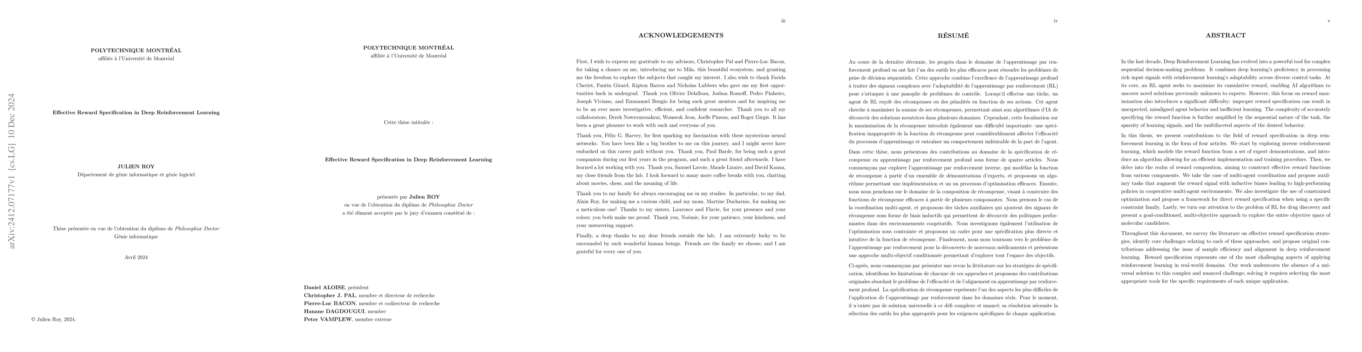 In the last decade, Deep Reinforcement Learning has evolved into a powerful tool for complex sequential decision-making problems. It combines deep learning's proficiency in processing rich input signals with reinforcement learning's adaptability across diverse control tasks. At its core, an RL agent seeks to maximize its cumulative reward, enabling AI algorithms to uncover novel solutions previously unknown to experts. However, this focus on reward maximization also introduces a significant difficulty: improper reward specification can result in unexpected, misaligned agent behavior and inefficient learning. The complexity of accurately specifying the reward function is further amplified by the sequential nature of the task, the sparsity of learning signals, and the multifaceted aspects of the desired behavior. In this thesis, we survey the literature on effective reward specification strategies, identify core challenges relating to each of these approaches, and propose original contributions addressing the issue of sample efficiency and alignment in deep reinforcement learning. Reward specification represents one of the most challenging aspects of applying reinforcement learning in real-world domains. Our work underscores the absence of a universal solution to this complex and nuanced challenge; solving it requires selecting the most appropriate tools for the specific requirements of each unique application.