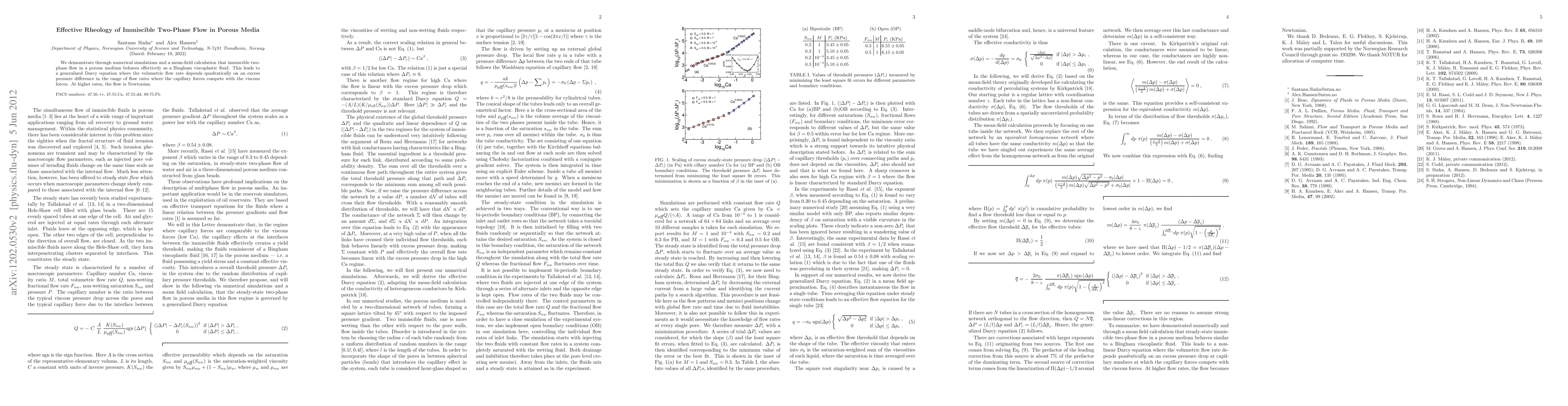 This study reveals that immiscible two-phase flow in porous media behaves like a Bingham viscoplastic fluid, leading to a generalized Darcy equation where flow rate depends quadratically on excess pressure differences at moderate flow rates, transitioning to Newtonian behavior at higher rates.