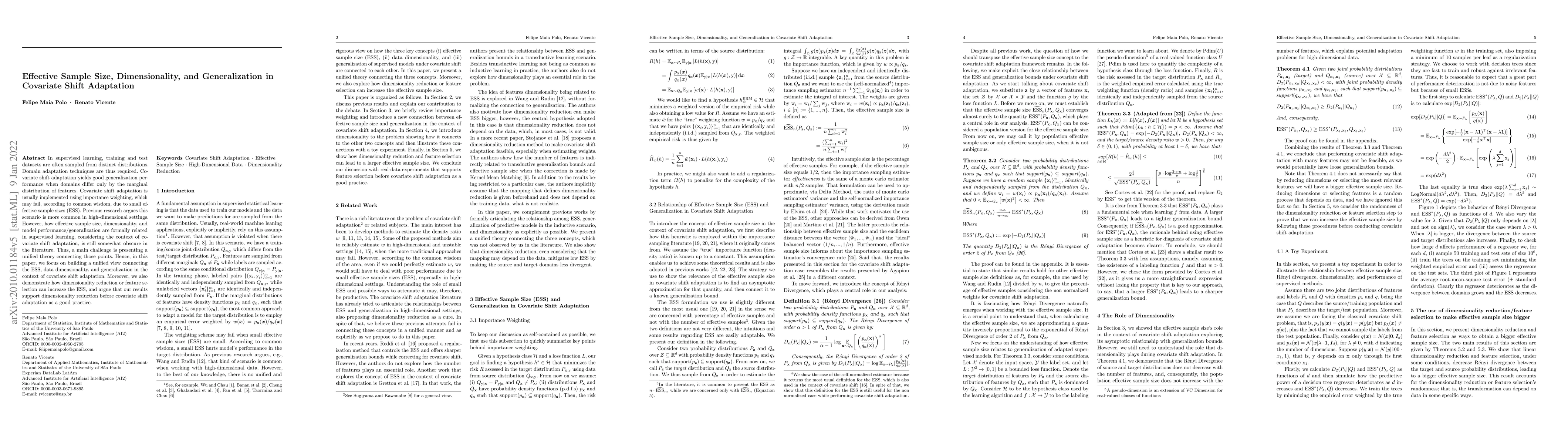 In supervised learning, training and test datasets are often sampled from distinct distributions. Domain adaptation techniques are thus required. Covariate shift adaptation yields good generalization performance when domains differ only by the marginal distribution of features. Covariate shift adaptation is usually implemented using importance weighting, which may fail, according to common wisdom, due to small effective sample sizes (ESS). Previous research argues this scenario is more common in high-dimensional settings. However, how effective sample size, dimensionality, and model performance/generalization are formally related in supervised learning, considering the context of covariate shift adaptation, is still somewhat obscure in the literature. Thus, a main challenge is presenting a unified theory connecting those points. Hence, in this paper, we focus on building a unified view connecting the ESS, data dimensionality, and generalization in the context of covariate shift adaptation. Moreover, we also demonstrate how dimensionality reduction or feature selection can increase the ESS, and argue that our results support dimensionality reduction before covariate shift adaptation as a good practice.