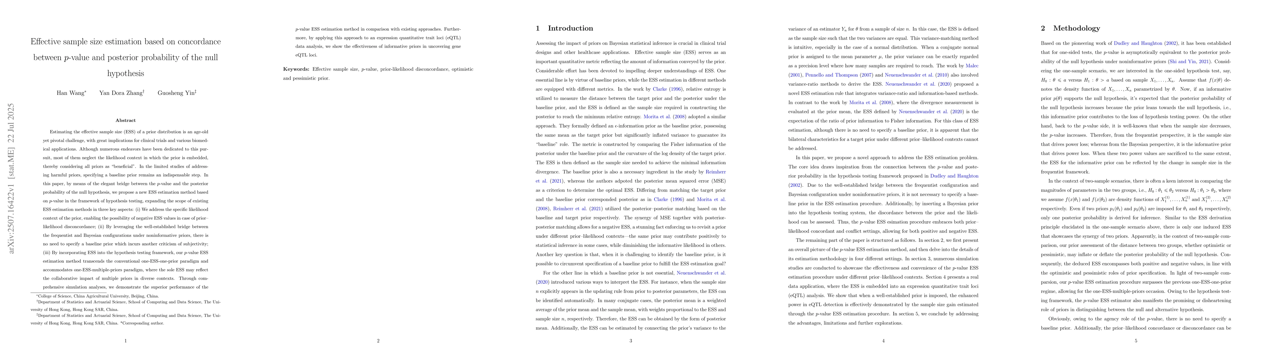 The paper proposes a novel method for effective sample size (ESS) estimation based on the concordance between p-value and posterior probability of the null hypothesis, addressing prior-likelihood disconcordance and eliminating the need for a baseline prior.