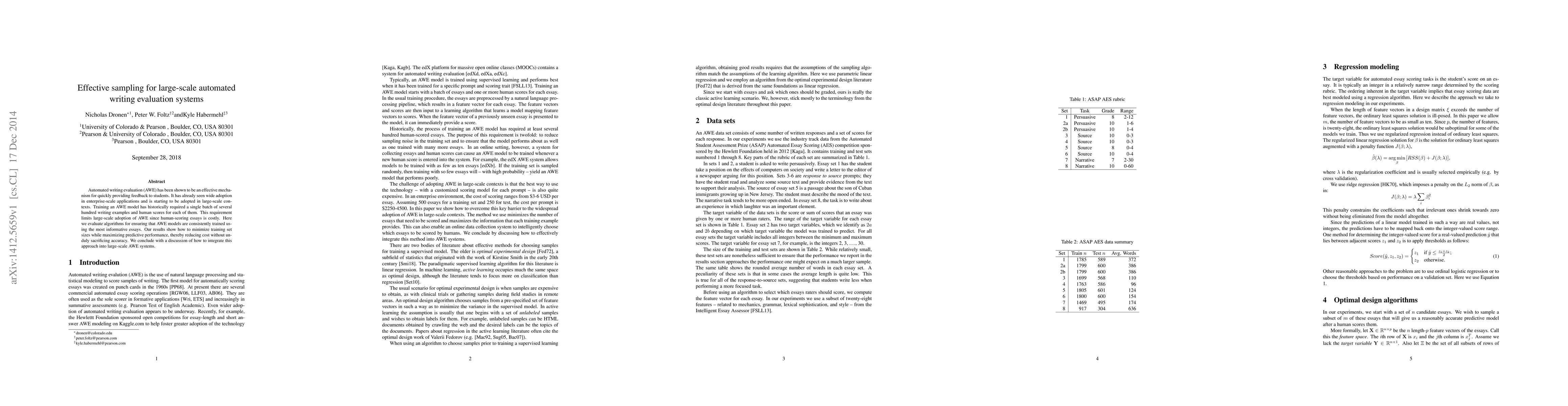 The paper proposes effective sampling algorithms to train large-scale automated writing evaluation (AWE) models using the most informative essays, minimizing training set size while maintaining predictive performance, thus reducing costs. The approach is shown to integrate seamlessly into large-scale AWE systems.