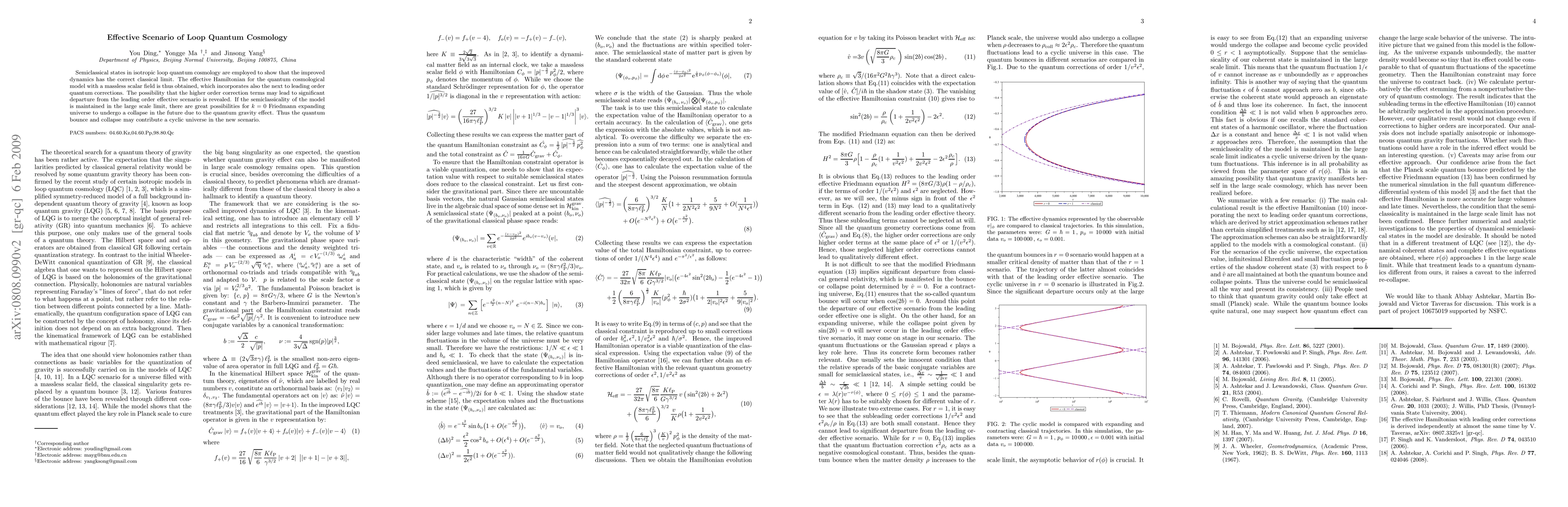 Semiclassical states in isotropic loop quantum cosmology are employed to show that the improved dynamics has the correct classical limit. The effective Hamiltonian for the quantum cosmological model with a massless scalar field is thus obtained, which incorporates also the next to leading order quantum corrections. The possibility that the higher order correction terms may lead to significant departure from the leading order effective scenario is revealed. If the semiclassicality of the model is maintained in the large scale limit, there are great possibilities for $k=0$ Friedmann expanding universe to undergo a collapse in the future due to the quantum gravity effect. Thus the quantum bounce and collapse may contribute a cyclic universe in the new scenario.