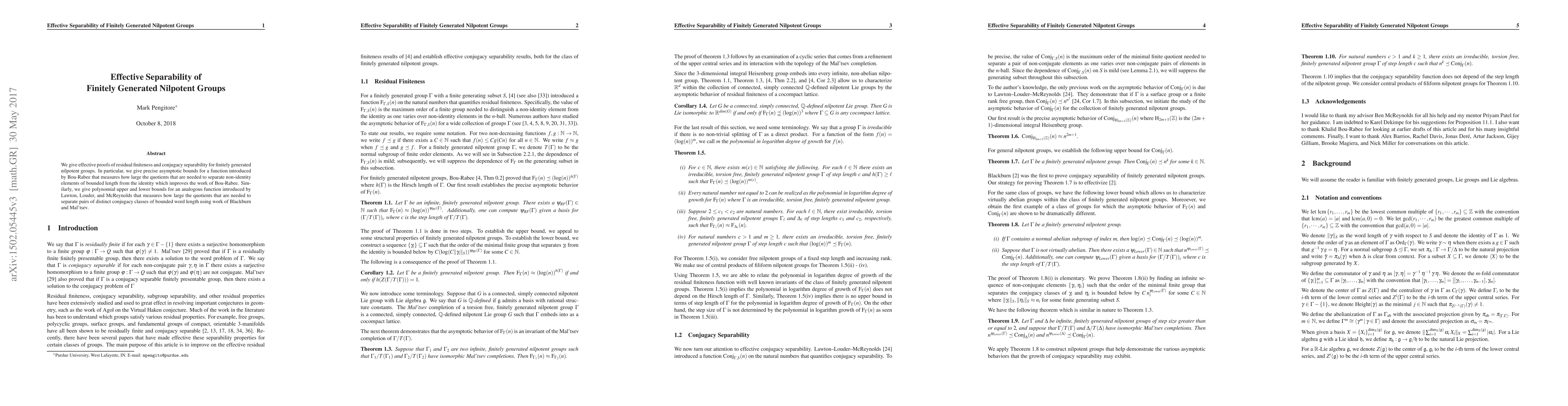 This paper provides effective proofs for the residual finiteness and conjugacy separability of finitely generated nilpotent groups, offering improved asymptotic bounds for functions measuring the size of quotients necessary to distinguish elements and conjugacy classes of bounded length.