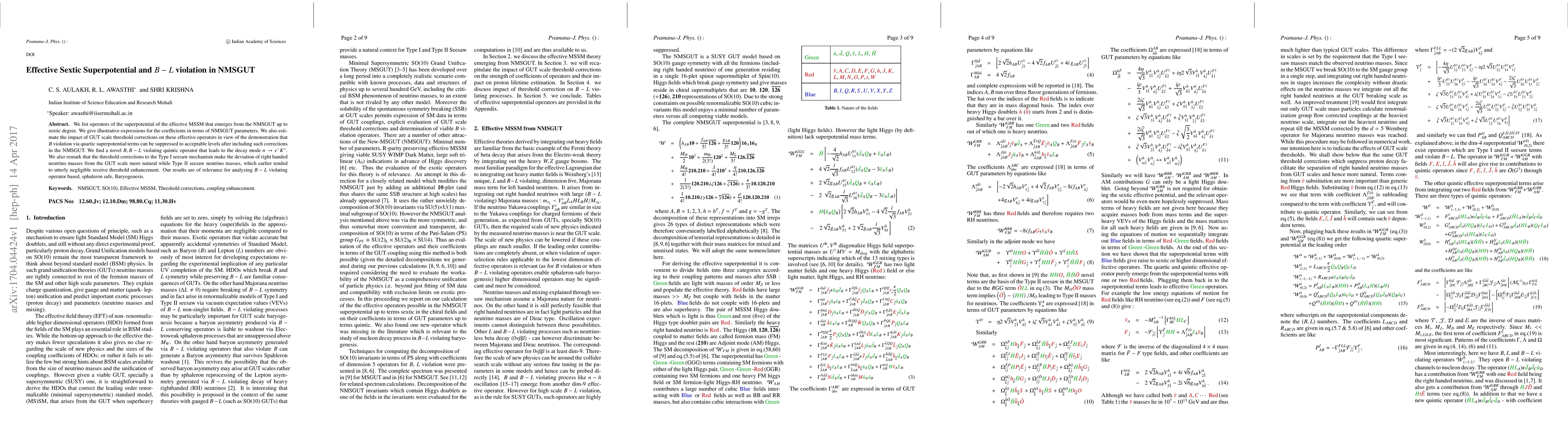This paper explores the NMSGUT model for B-L violation and discovers a novel quintic operator leading to rare n->e^- K^+ decays. It also investigates threshold corrections on neutrino masses and their implications for Baryogenesis.
