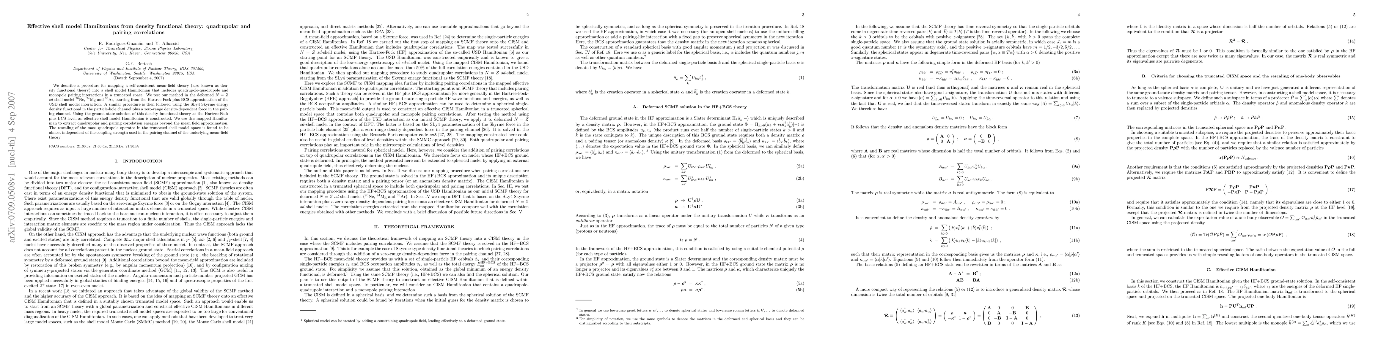 This paper develops a method to derive effective shell model Hamiltonians from density functional theory, incorporating quadrupole-quadrupole and monopole pairing interactions. The approach is tested on N=Z sd-shell nuclei, showing that the mapped Hamiltonian can extract quadrupolar and pairing correlations beyond mean-field approximations, with the mass quadrupole operator rescaling remaining consistent across different coupling strengths.