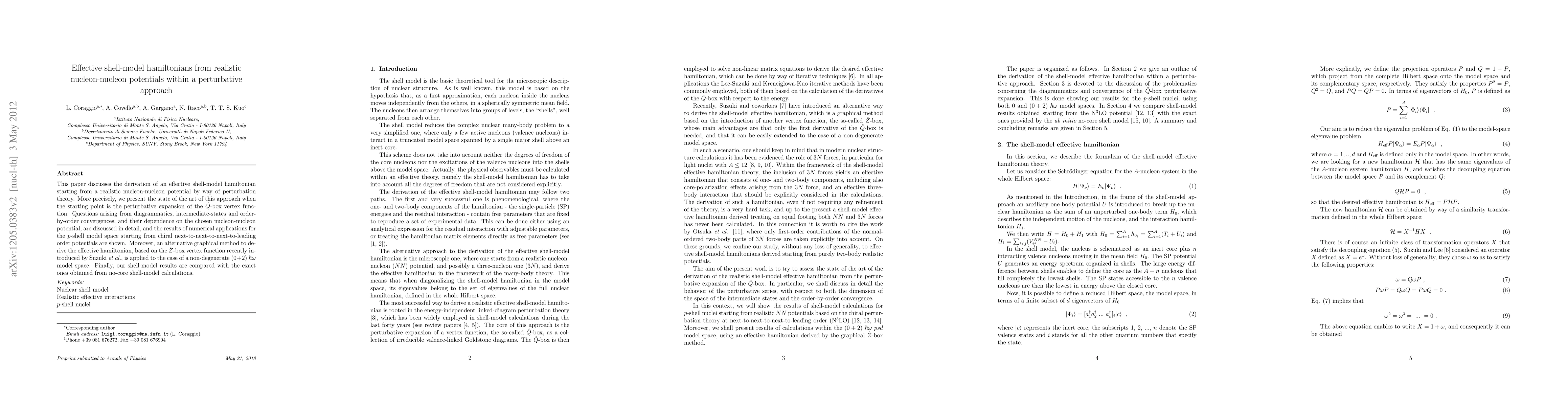 This paper discusses the derivation of an effective shell-model hamiltonian starting from a realistic nucleon-nucleon potential by way of perturbation theory. More precisely, we present the state of the art of this approach when the starting point is the perturbative expansion of the Q-box vertex function. Questions arising from diagrammatics, intermediate-states and order-by-order convergences, and their dependence on the chosen nucleon-nucleon potential, are discussed in detail, and the results of numerical applications for the p-shell model space starting from chiral next-to-next-to-next-to-leading order potentials are shown. Moreover, an alternative graphical method to derive the effective hamiltonian, based on the Z-box vertex function recently introduced by Suzuki et al., is applied to the case of a non-degenerate (0+2) hbaromega model space. Finally, our shell-model results are compared with the exact ones obtained from no-core shell-model calculations.