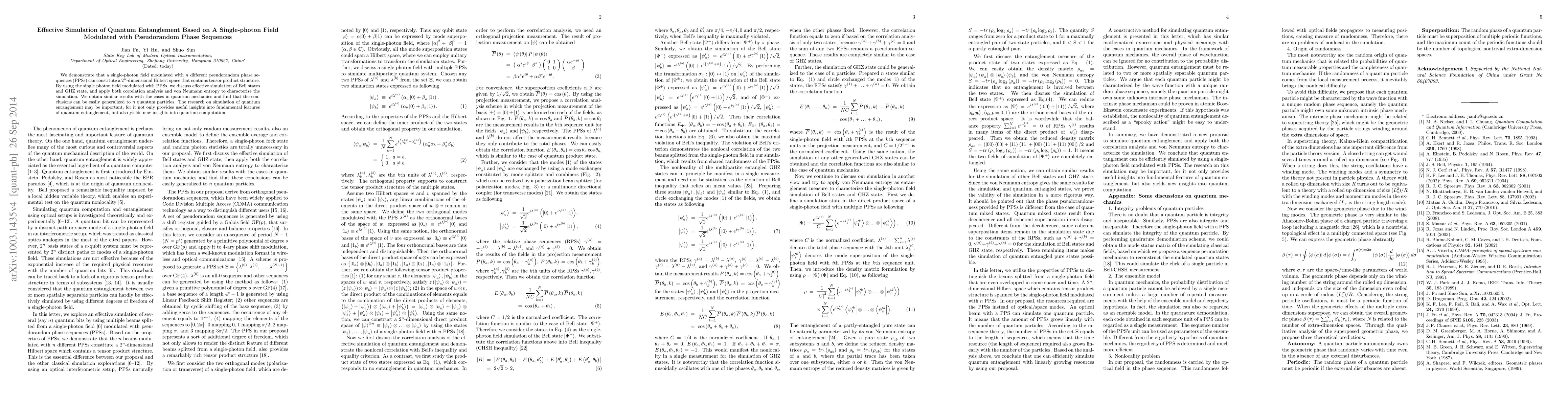 This paper demonstrates the effective simulation of quantum entanglement using a single-photon field modulated with pseudorandom phase sequences, showing the formation of a 2^n-dimensional Hilbert space. It successfully simulates Bell and GHZ states and uses correlation analysis and von Neumann entropy to characterize the simulation, finding results comparable to quantum mechanics and suggesting generalizability to n quantum particles.