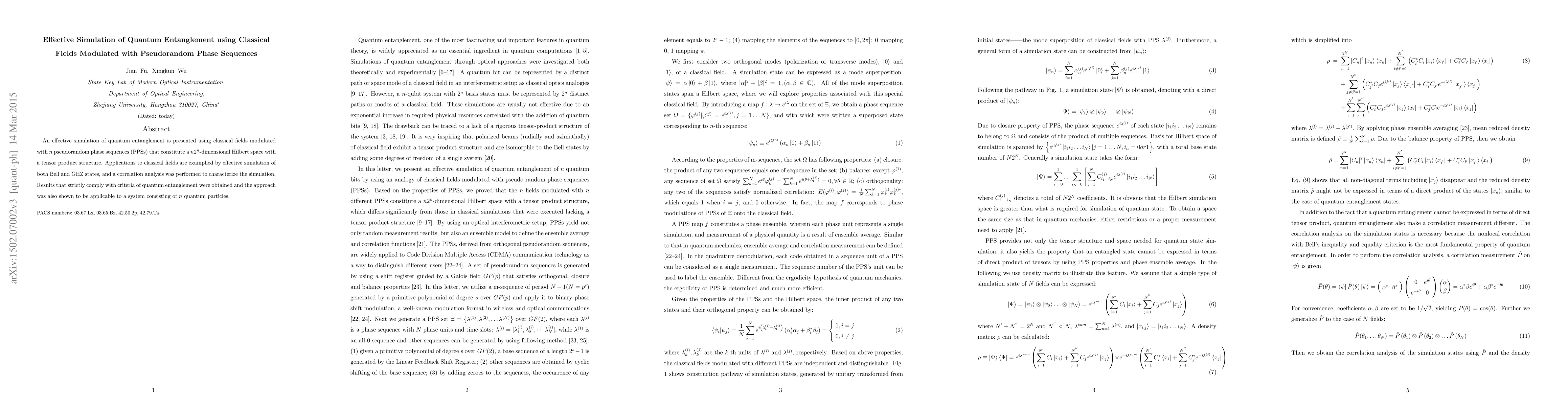 An effective simulation of quantum entanglement is presented using classical fields modulated with n pseudorandom phase sequences (PPSs) that constitute a n2^n-dimensional Hilbert space with a tensor product structure. Applications to classical fields are examplied by effective simulation of both Bell and GHZ states, and a correlation analysis was performed to characterize the simulation. Results that strictly comply with criteria of quantum entanglement were obtained and the approach was also shown to be applicable to a system consisting of n quantum particles.