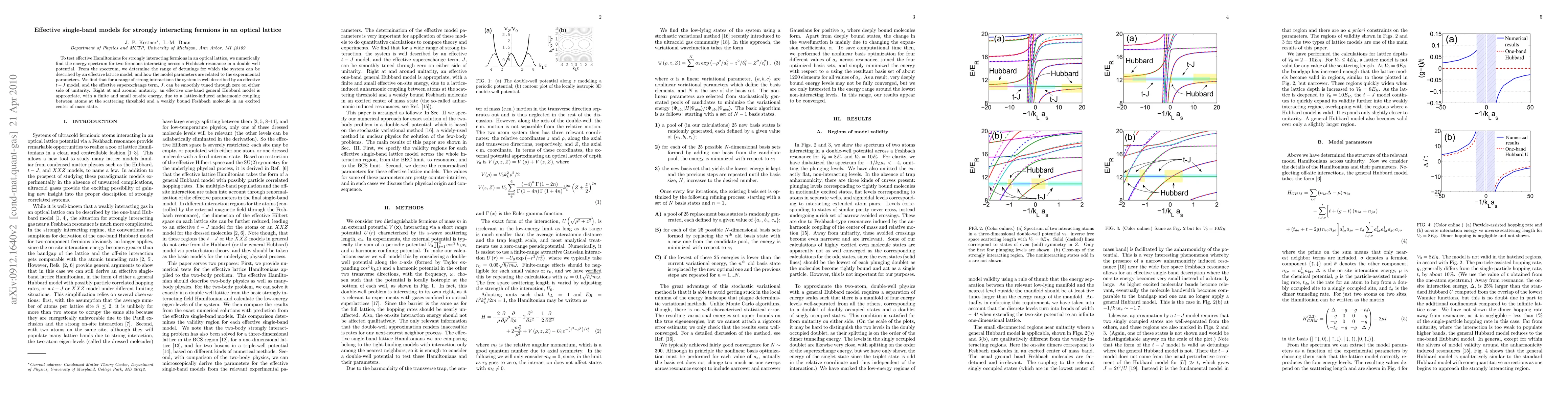 To test effective Hamiltonians for strongly interacting fermions in an optical lattice, we numerically find the energy spectrum for two fermions interacting across a Feshbach resonance in a double well potential. From the spectrum, we determine the range of detunings for which the system can be described by an effective lattice model, and how the model parameters are related to the experimental parameters. We find that for a range of strong interactions the system is well described by an effective $t-J$ model, and the effective superexchange term, $J$, can be smoothly tuned through zero on either side of unitarity. Right at and around unitarity, an effective one-band general Hubbard model is appropriate, with a finite and small on-site energy, due to a lattice-induced anharmonic coupling between atoms at the scattering threshold and a weakly bound Feshbach molecule in an excited center of mass state.