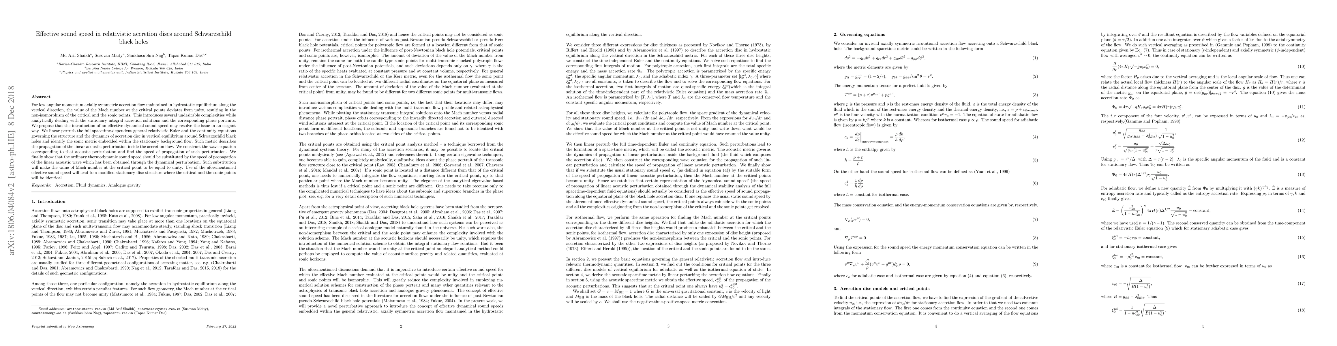 This paper proposes an effective dynamical sound speed to resolve complexities in relativistic accretion discs around Schwarzschild black holes, where the Mach number deviates from unity at critical points. By introducing this effective sound speed, the authors achieve a modified stationary disc structure where critical and sonic points coincide.