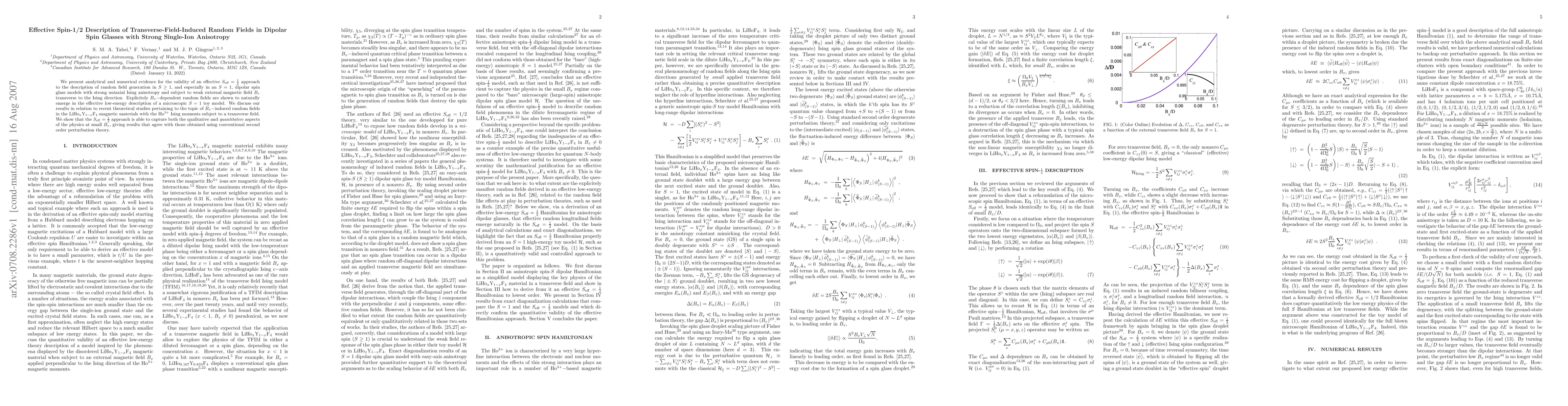 We present analytical and numerical evidence for the validity of an effective S=1/2 approach to the description of random field generation in S>=1, and especially in an S=1, dipolar spin glass models with strong uniaxial Ising anisotropy and subject to weak external magnetic field Bx transverse to the Ising direction. Explicitely Bx-dependent random fields are shown to naturally emerge in the effective low-energy description of a microscopic S=1 toy model. We discuss our results in relation to recent theoretical studies pertaining to the topic of Bx-induced random fields in the LiHo$_x$Y$_{1-x}$F$_4$ magnetic materials with the Ho$^{3+}$ Ising moments subject to a transverse field. We show that the S_{eff}=1/2 approach is able to capture both the qualitative and quantitative aspects of the physics at small Bx, giving results that agree with those obtained using conventional second order perturbation theory.