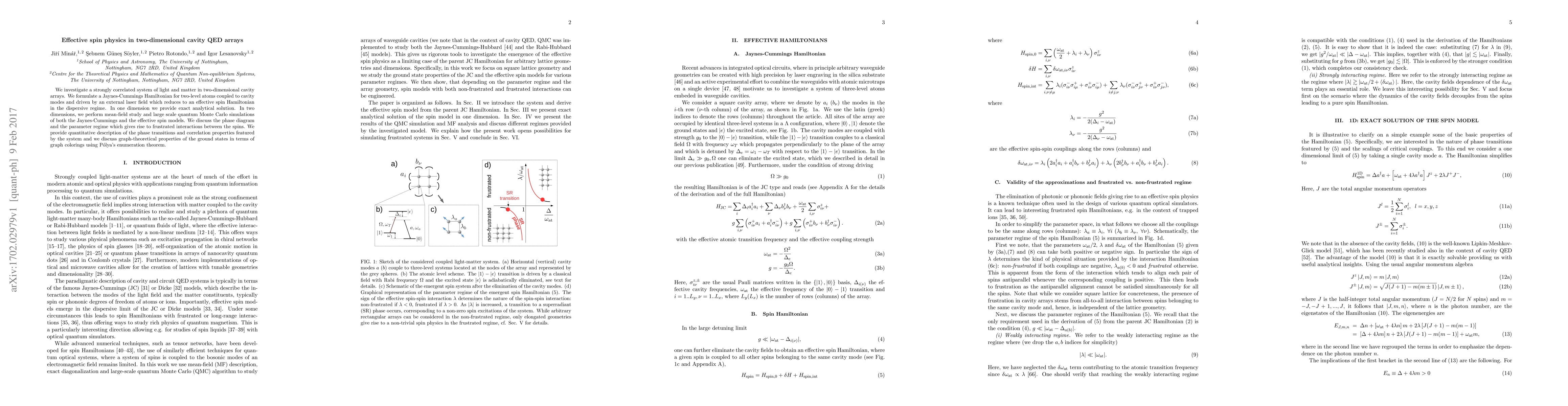 We investigate a strongly correlated system of light and matter in two-dimensional cavity arrays. We formulate a Jaynes-Cummings Hamiltonian for two-level atoms coupled to cavity modes and driven by an external laser field which reduces to an effective spin Hamiltonian in the dispersive regime. In one dimension we provide exact analytical solution. In two dimensions, we perform mean-field study and large scale quantum Monte Carlo simulations of both the Jaynes-Cummings and the effective spin models. We discuss the phase diagram and the parameter regime which gives rise to frustrated interactions between the spins. We provide quantitative description of the phase transitions and correlation properties featured by the system and we discuss graph-theoretical properties of the ground states in terms of graph colorings using P\'{o}lya's enumeration theorem.