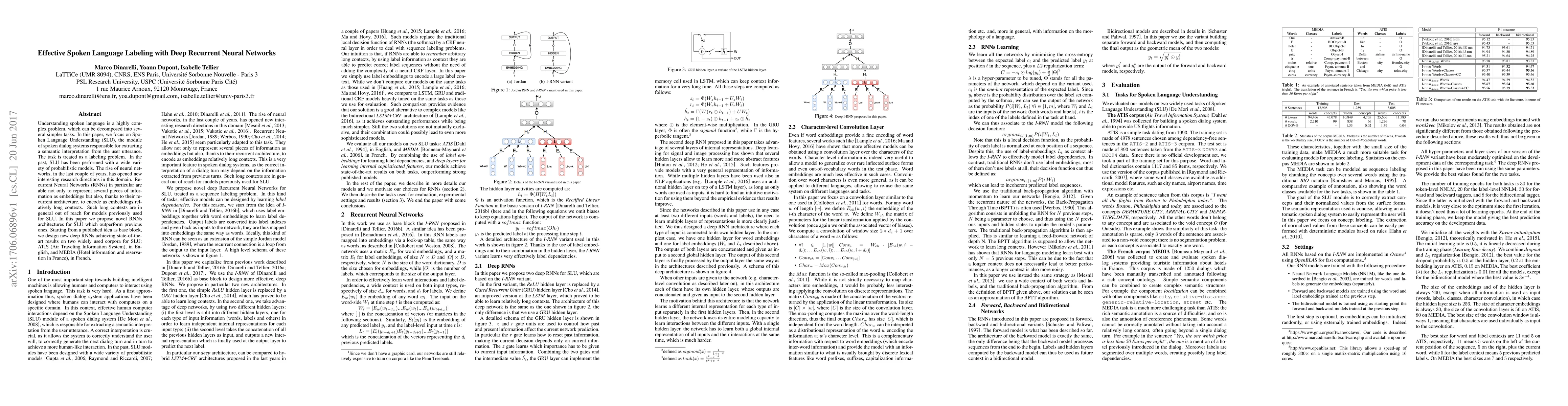 Understanding spoken language is a highly complex problem, which can be decomposed into several simpler tasks. In this paper, we focus on Spoken Language Understanding (SLU), the module of spoken dialog systems responsible for extracting a semantic interpretation from the user utterance. The task is treated as a labeling problem. In the past, SLU has been performed with a wide variety of probabilistic models. The rise of neural networks, in the last couple of years, has opened new interesting research directions in this domain. Recurrent Neural Networks (RNNs) in particular are able not only to represent several pieces of information as embeddings but also, thanks to their recurrent architecture, to encode as embeddings relatively long contexts. Such long contexts are in general out of reach for models previously used for SLU. In this paper we propose novel RNNs architectures for SLU which outperform previous ones. Starting from a published idea as base block, we design new deep RNNs achieving state-of-the-art results on two widely used corpora for SLU: ATIS (Air Traveling Information System), in English, and MEDIA (Hotel information and reservation in France), in French.
