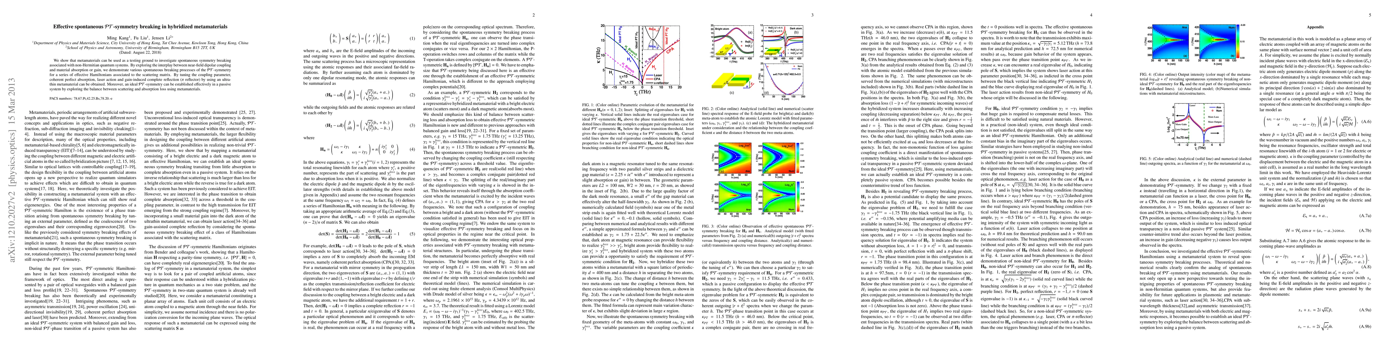 We show that metamaterials can be used as a testing ground to investigate spontaneous symmetry breaking associated with non-Hermitian quantum systems. By exploring the interplay between near-field dipolar coupling and material absorption or gain, we demonstrate various spontaneous breaking processes of the $\mathcal{PT}$-symmetry for a series of effective Hamiltonians associated to the scattering matrix. By tuning the coupling parameter, coherent perfect absorption, laser action and gain-induced complete reflection ($\pi$ reflector) by using an ultra-thin metamaterial can be obtained. Moreover, an ideal $\mathcal{PT}$-symmetry can be established effectively in a passive system by exploring the balance between scattering and absorption loss using metamaterials.