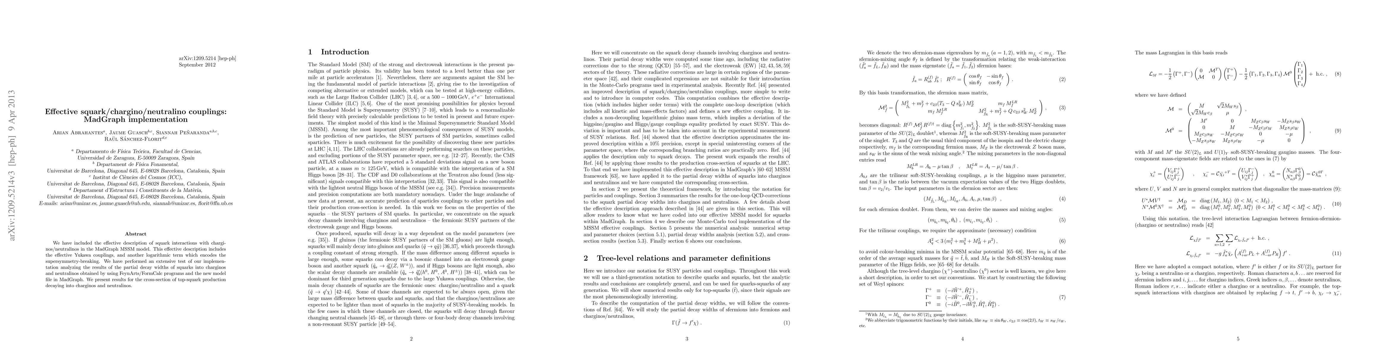 We have included the effective description of squark interactions with charginos/neutralinos in the MadGraph MSSM model. This effective description includes the effective Yukawa couplings, and another logarithmic term which encodes the supersymmetry-breaking. We have performed an extensive test of our implementation analyzing the results of the partial decay widths of squarks into charginos and neutralinos obtained by using FeynArts/FormCalc programs and the new model file in MadGraph. We present results for the cross-section of top-squark production decaying into charginos and neutralinos.