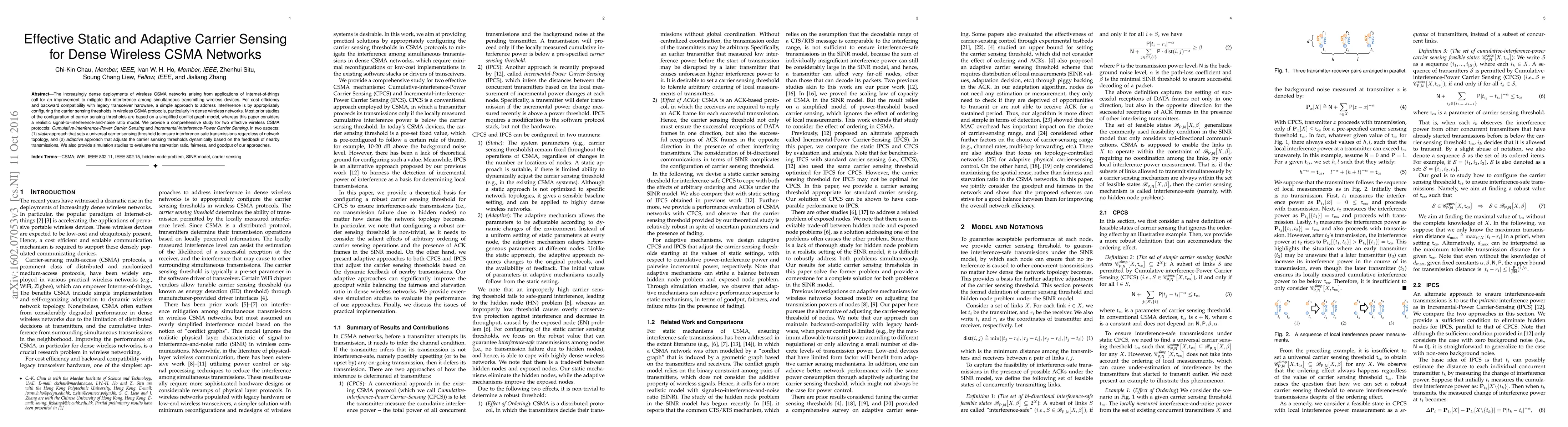 This paper proposes two effective carrier sensing protocols for dense wireless CSMA networks to mitigate interference: Cumulative-interference-Power Carrier Sensing and Incremental-interference-Power Carrier Sensing. It evaluates both static and adaptive approaches to configure carrier sensing thresholds, considering realistic signal conditions and providing simulation results on starvation ratio, fairness, and goodput.