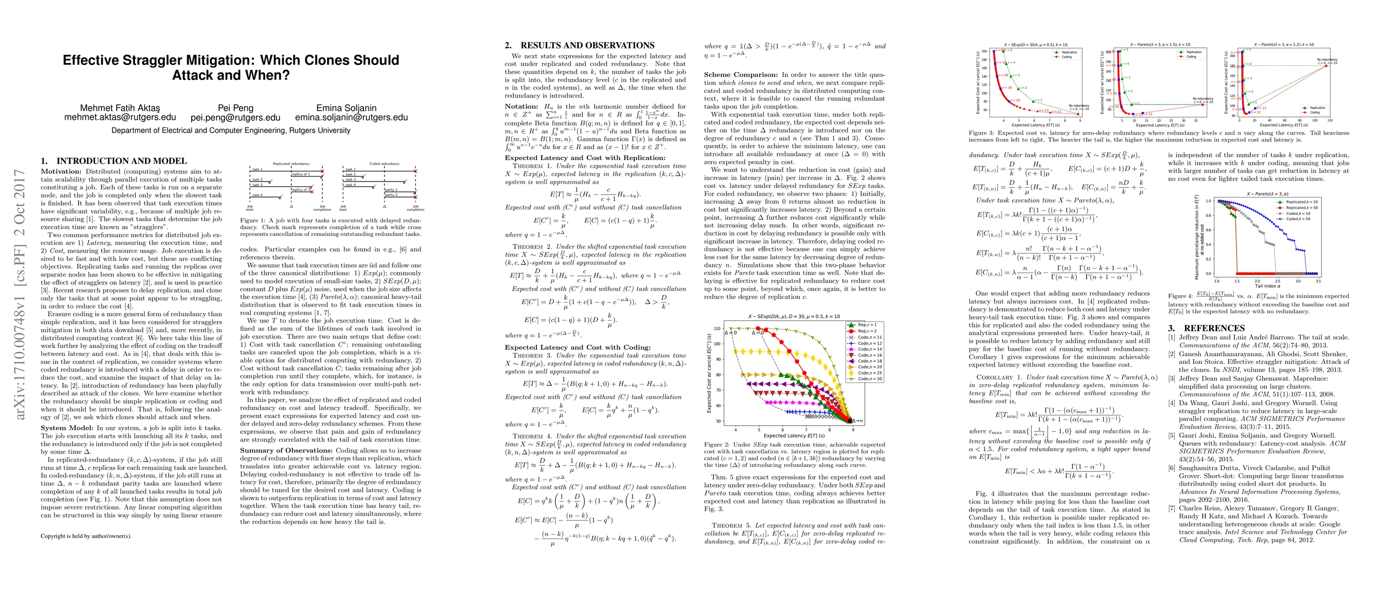 This paper analyzes the trade-offs between cost and latency in straggler mitigation using redundancy techniques like replication and erasure coding in distributed computing. It finds that coded redundancy offers better cost vs. latency trade-offs and can reduce both cost and latency under less heavy-tailed task execution times, while delaying redundancy does not effectively reduce cost.