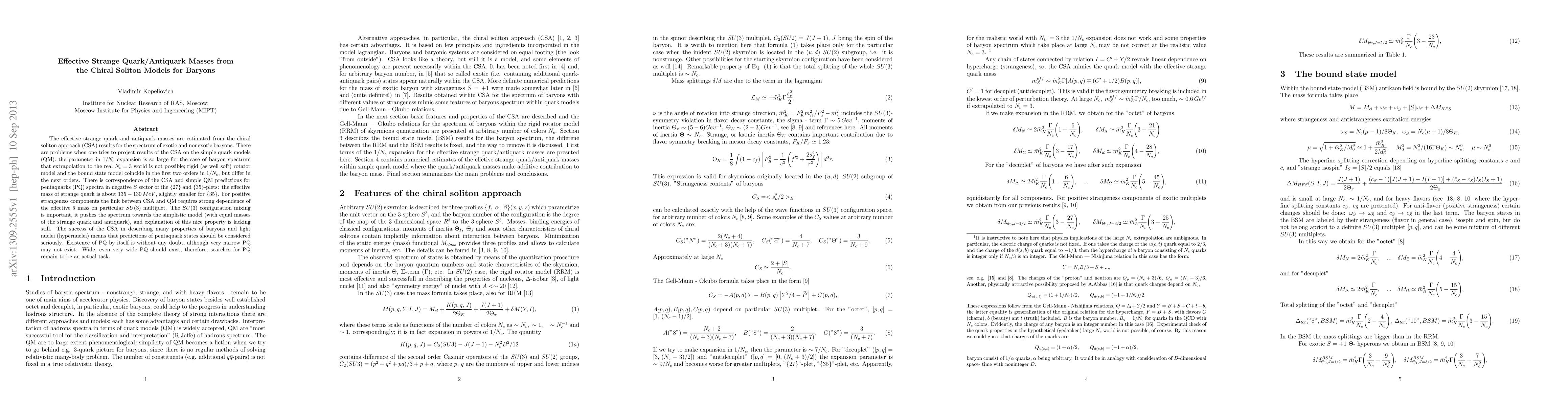 The effective strange quark and antiquark masses are estimated from the chiral soliton approach (CSA) results for the spectrum of exotic and nonexotic baryons. There are problems when one tries to project results of the CSA on the simple quark models (QM): the parameter in $1/N_c$ expansion is so large for the case of the baryon spectrum that extrapolation to the real $N_c=3$ world is not possible; rigid (as well soft) rotator model and the bound state model coincide in the first two orders in $1/N_c$, but differ in the next orders. There is correspondence of the CSA and simple QM predictions for pentaquarks (PQ) spectra in negative $S$ sector of the $\{27\}$ and $\{35\}$-plets: the effective mass of strange quark is about $135 -130\,MeV$, slightly smaller for $\{35\}$. For positive strangeness components the link between CSA and QM requires strong dependence of the effective $\bar{s}$ mass on particular SU(3) multiplet. The SU(3) configuration mixing is important, it pushes the spectrum towards the simplistic model (with equal masses of the strange quark and antiquark), and explanation of this nice property is lacking still. The success of the CSA in describing many properties of baryons and light nuclei (hypernuclei) means that predictions of pentaquark states should be considered seriously. Existence of PQ by itself is without any doubt, although very narrow PQ may not exist. Wide, even very wide PQ should exist, therefore, searches for PQ remain to be an actual task.