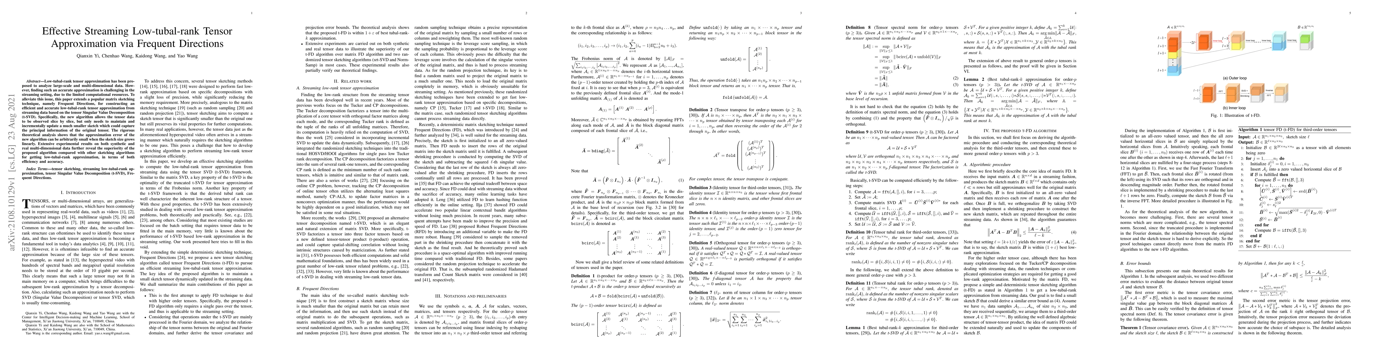 This paper proposes an efficient streaming algorithm based on Frequent Directions for low-tubal-rank tensor approximation, leveraging tensor Singular Value Decomposition (t-SVD). The method incrementally updates a small sketch to capture principal tensor information, achieving small approximation error with linear growth in sketch size.
