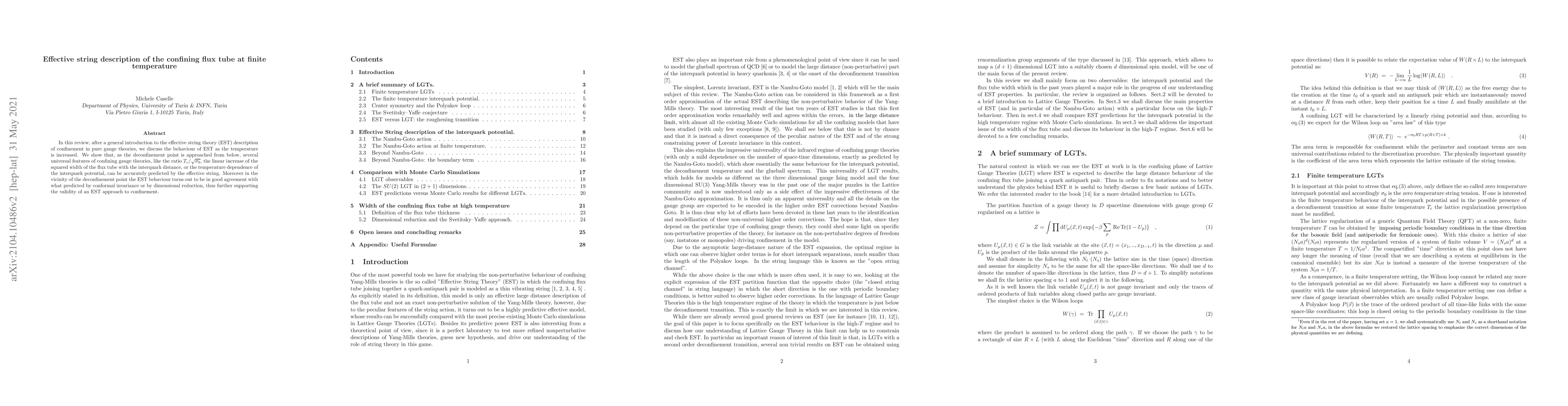 In this review, after a general introduction to the effective string theory (EST) description of confinement in pure gauge theories, we discuss the behaviour of EST as the temperature is increased. We show that, as the deconfinement point is approached from below, several universal features of confining gauge theories, like the ratio $T_c/\sqrt{\sigma_0}$, the linear increase of the squared width of the flux tube with the interquark distance, or the Temperature dependence of the interquark potential, can be accurately predicted by the effective string. Moreover in the vicinity of the deconfinement point the EST behaviour turns out to be in good agreement with what predicted by conformal invariance or by dimensional reduction, thus further supporting the validity of and EST approach to confinement.