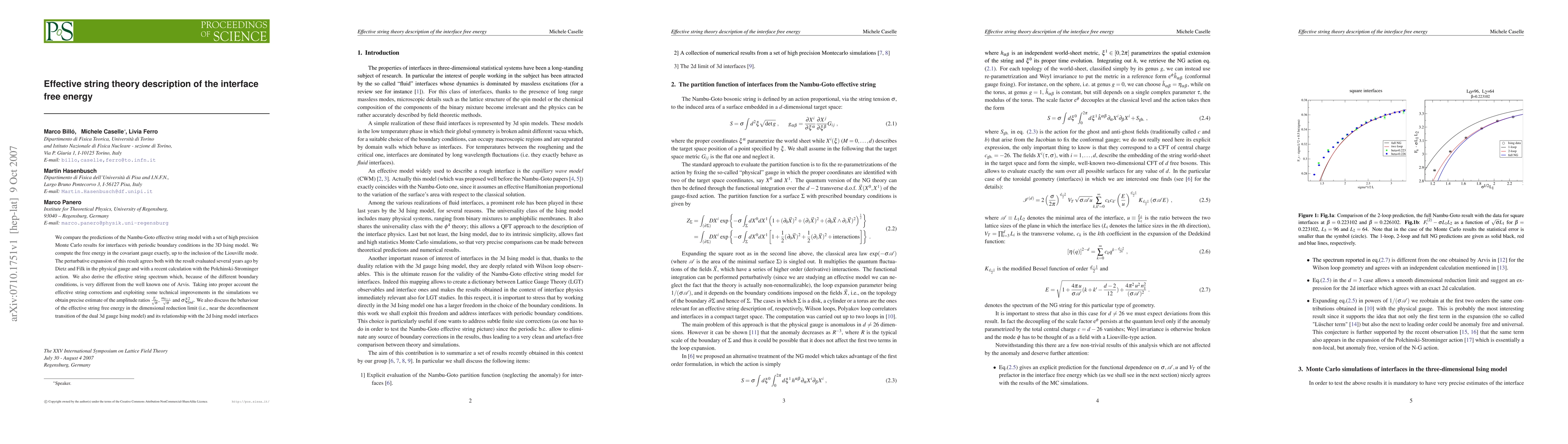 We compare the predictions of the Nambu-Goto effective string model with a set of high precision Monte Carlo results for interfaces with periodic boundary conditions in the 3D Ising model. We compute the free energy in the covariant gauge exactly, up to the inclusion of the Liouville mode. The perturbative expansion of this result agrees both with the result evaluated several years ago by Dietz and Filk in the physical gauge and with a recent calculation with the Polchinski-Strominger action. We also derive the effective string spectrum which, because of the different boundary conditions, is very different from the well known one of Arvis. Taking into proper account the effective string corrections and exploiting some technical improvements in the simulations we obtain precise estimate of the amplitude ratios T_c/\sqrt{sigma}, m_{0++}/\sqrt{\sigma} and sigma xi_{2nd}^2. We also discuss the behaviour of the effective string free energy in the dimensional reduction limit (i.e., near the deconfinement transition of the dual 3d gauge Ising model) and its relationship with the 2d Ising model interfaces