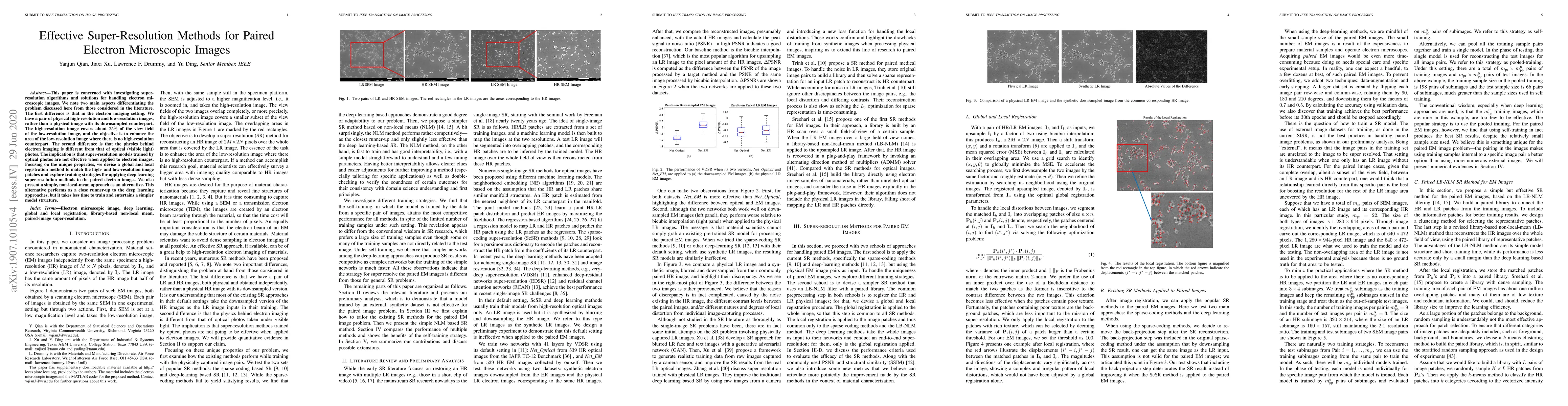 This paper is concerned with investigating super-resolution algorithms and solutions for handling electron microscopic images. We note two main aspects differentiating the problem discussed here from those considered in the literature. The first difference is that in the electron imaging setting. We have a pair of physical high-resolution and low-resolution images, rather than a physical image with its downsampled counterpart. The high-resolution image covers about 25% of the view field of the low-resolution image, and the objective is to enhance the area of the low-resolution image where there is no high-resolution counterpart. The second difference is that the physics behind electron imaging is different from that of optical (visible light) photos. The implication is that super-resolution models trained by optical photos are not effective when applied to electron images. Focusing on the unique properties, we devise a global and local registration method to match the high- and low-resolution image patches and explore training strategies for applying deep learning super-resolution methods to the paired electron images. We also present a simple, non-local-mean approach as an alternative. This alternative performs as a close runner-up to the deep learning approaches, but it takes less time to train and entertains a simpler model structure.