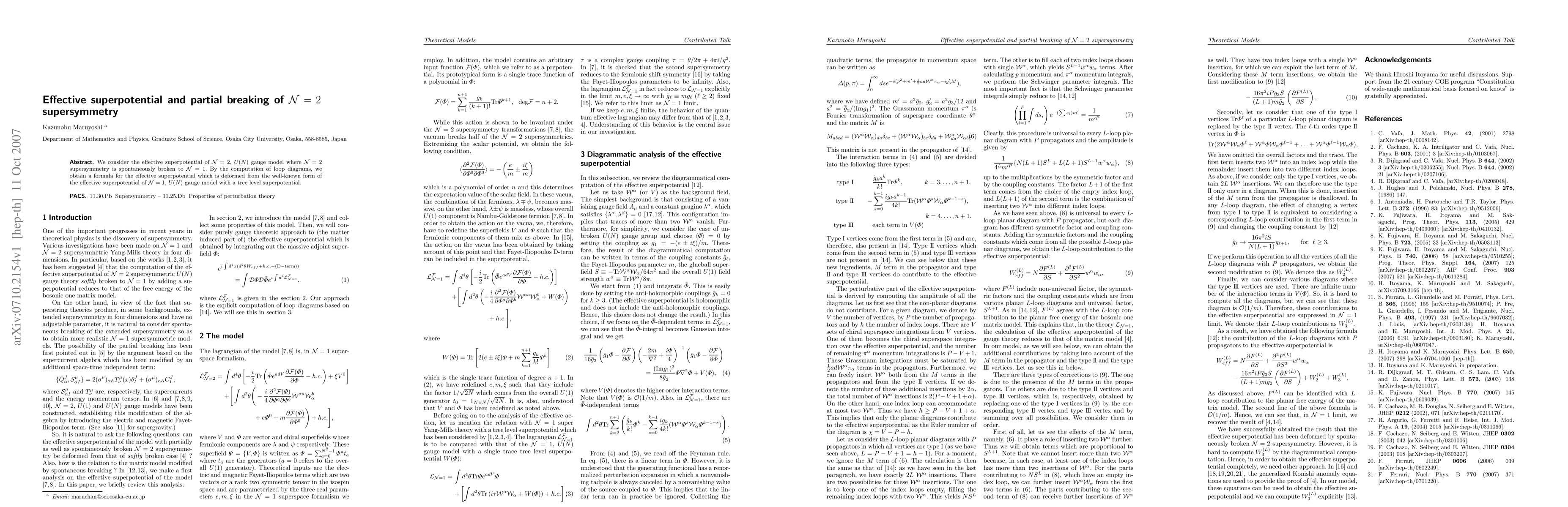 This paper investigates the effective superpotential in an N=2, U(N) gauge model where N=2 supersymmetry is spontaneously broken to N=1. The authors derive a formula for the deformed effective superpotential through the computation of loop diagrams, differing from the standard N=1, U(N) gauge model.