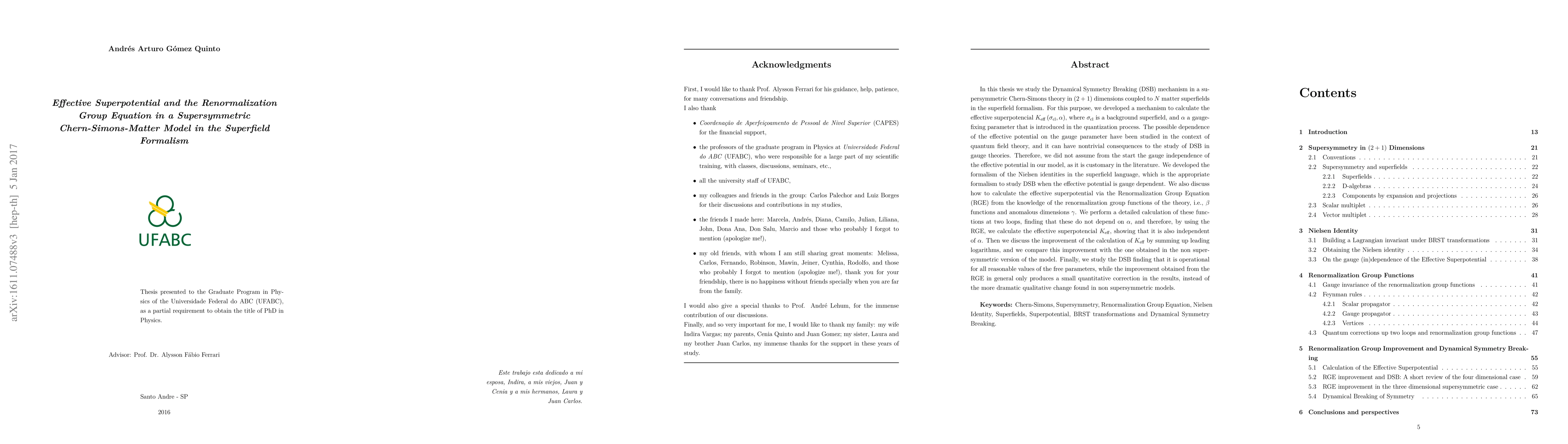 We studied the Dynamical Symmetry Breaking (DSB) mechanism in a supersymmetric Chern-Simons theory in $\left(2+1\right)$ dimensions coupled to $N$ matter superfields in the superfield formalism. For this purpose, we developed a mechanism to calculate the effective superpotencial $K_{\mathrm{eff}}\left(\sigma_{\mathrm{cl}},\alpha\right)$, where $\sigma_{\mathrm{cl}}$ is a background superfield, and $\alpha$ a gauge-fixing parameter that is introduced in the quantization process. The possible dependence of the effective potential on the gauge parameter have been studied in the context of quantum field theory. We developed the formalism of the Nielsen identities in the superfield language, which is the appropriate formalism to study DSB when the effective potential is gauge dependent. We also discuss how to calculate the effective superpotential via the Renormalization Group Equation (RGE) from the knowledge of the renormalization group functions of the theory, i.e., $\beta$ functions and anomalous dimensions $\gamma$. We perform a detailed calculation of these functions at two loops, finding that these do not depend on $\alpha$, and therefore, by using the RGE, we calculate the effective superpotencial $K_{\mathrm{eff}}$, showing that it is also independent of $\alpha$. Then we discuss the improvement of the calculation of $K_{\mathrm{eff}}$ by summing up leading logarithms, and we compare this improvement with the one obtained in the non supersymmetric version of the model. Finally, we study the DSB finding that it is operational for all reasonable values of the free parameters, while the improvement obtained from the RGE in general only produces a small quantitative correction in the results, instead of the more dramatic qualitative change found in non supersymmetric models.