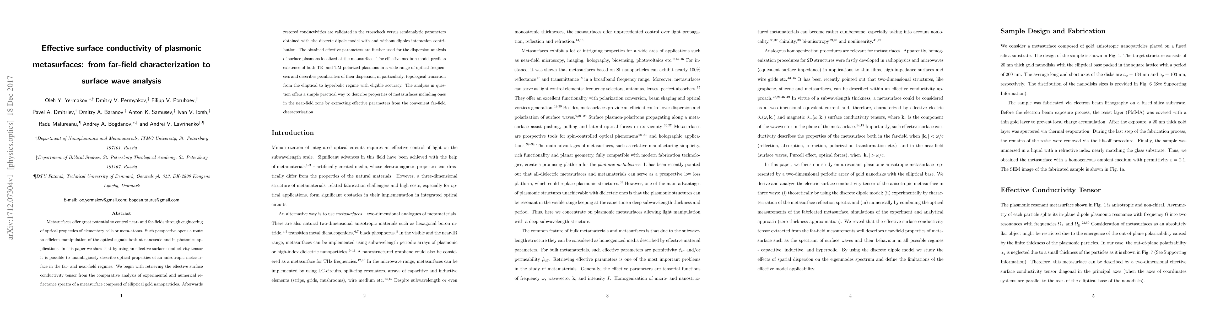 This paper demonstrates how an effective surface conductivity tensor can describe the optical properties of anisotropic metasurfaces in both far-field and near-field regimes. The tensor is derived from experimental and numerical reflectance spectra of gold nanoparticle metasurfaces, validated against semianalytic models, and used to analyze surface plasmon dispersion, revealing TE- and TM-polarized plasmons and their topological transitions.