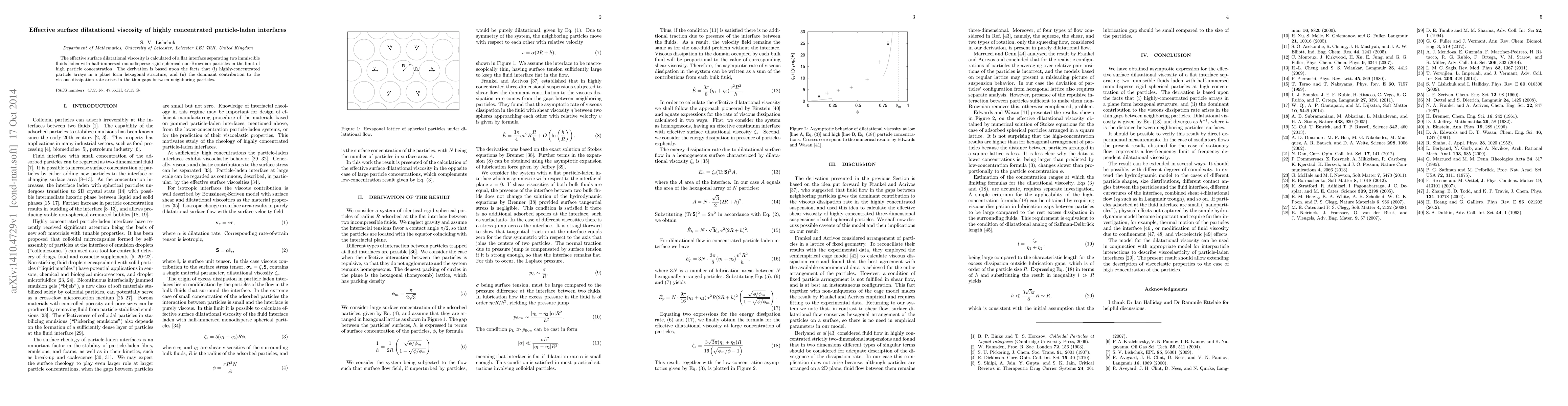 This paper calculates the effective surface dilatational viscosity for highly concentrated particle-laden interfaces, finding that hexagonal particle arrays and viscous dissipation in thin gaps between particles dominate the interfacial behavior.