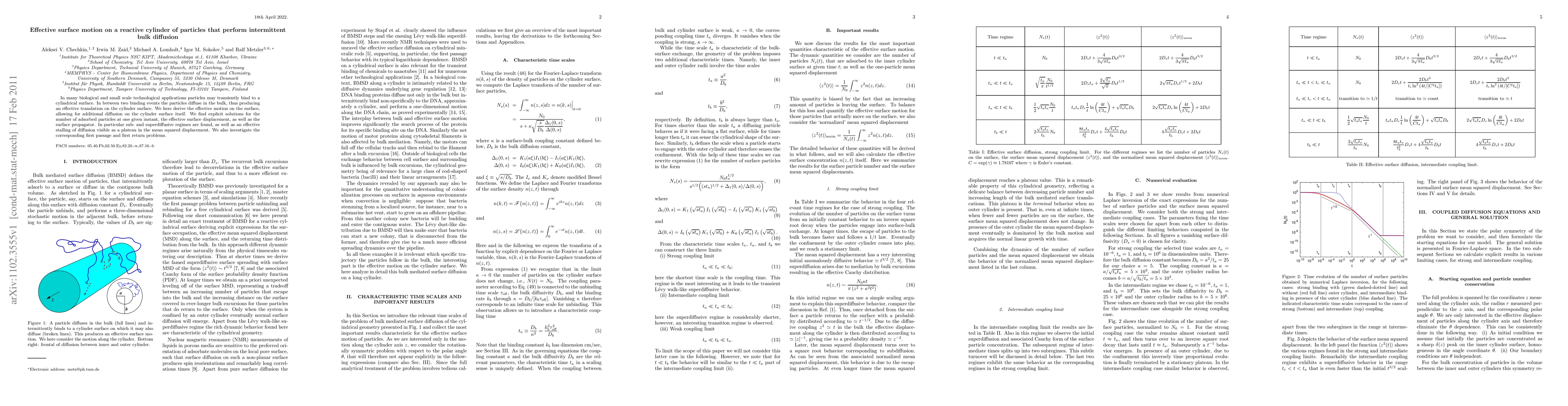 In many biological and small scale technological applications particles may transiently bind to a cylindrical surface. In between two binding events the particles diffuse in the bulk, thus producing an effective translation on the cylinder surface. We here derive the effective motion on the surface, allowing for additional diffusion on the cylinder surface itself. We find explicit solutions for the number of adsorbed particles at one given instant, the effective surface displacement, as well as the surface propagator. In particular sub- and superdiffusive regimes are found, as well as an effective stalling of diffusion visible as a plateau in the mean squared displacement. We also investigate the corresponding first passage and first return problems.