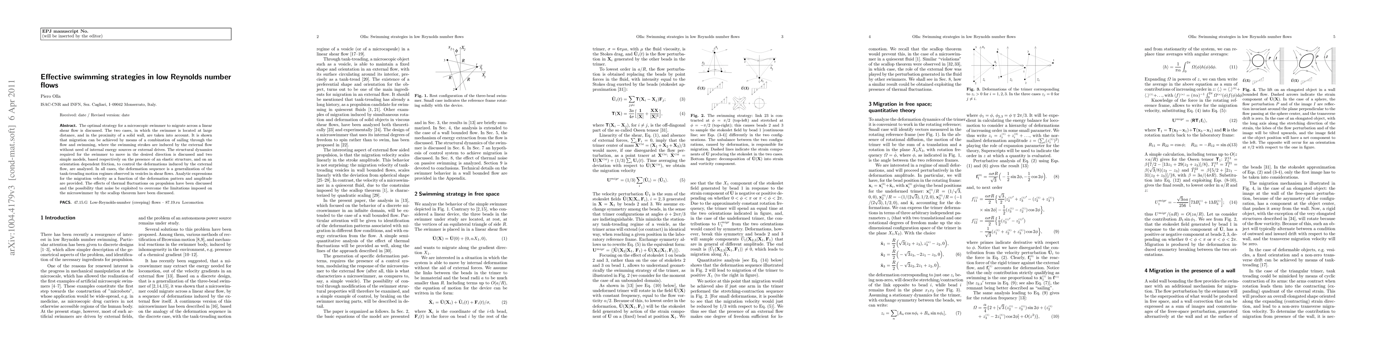 The optimal strategy for a microscopic swimmer to migrate across a linear shear flow is discussed. The two cases, in which the swimmer is located at large distance, and in the proximity of a solid wall, are taken into account. It is shown that migration can be achieved by means of a combination of sailing through the flow and swimming, where the swimming strokes are induced by the external flow without need of internal energy sources or external drives. The structural dynamics required for the swimmer to move in the desired direction is discussed and two simple models, based respectively on the presence of an elastic structure, and on an orientation dependent friction, to control the deformations induced by the external flow, are analyzed. In all cases, the deformation sequence is a generalization of the tank-treading motion regimes observed in vesicles in shear flows. Analytic expressions for the migration velocity as a function of the deformation pattern and amplitude are provided. The effects of thermal fluctuations on propulsion have been discussed and the possibility that noise be exploited to overcome the limitations imposed on the microswimmer by the scallop theorem have been discussed.