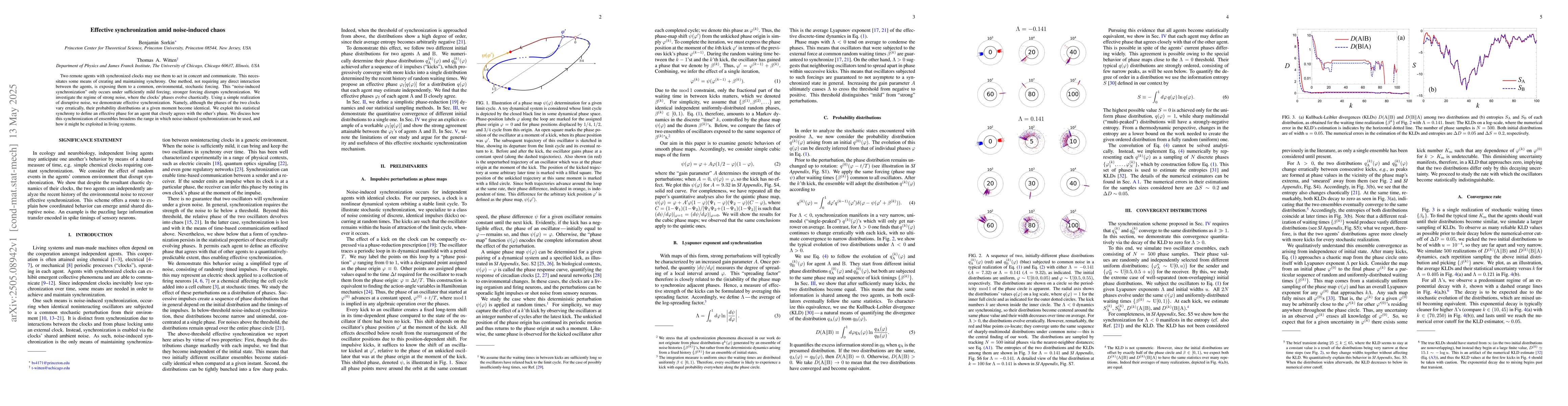 Two remote agents with synchronized clocks may use them to act in concert and communicate. This necessitates some means of creating and maintaining synchrony. One method, not requiring any direct interaction between the agents, is exposing them to a common, environmental, stochastic forcing. This "noise-induced synchronization" only occurs under sufficiently mild forcing; stronger forcing disrupts synchronization. We investigate the regime of strong noise, where the clocks' phases evolve chaotically. Using a simple realization of disruptive noise, we demonstrate effective synchronization. Namely, although the phases of the two clocks vary erratically, their probability distributions at a given moment become identical. We exploit this statistical synchrony to define an effective phase for an agent that closely agrees with the other's phase. We discuss how this synchronization of ensembles broadens the range in which noise-induced synchronization can be used, and how it might be exploited in living systems.
