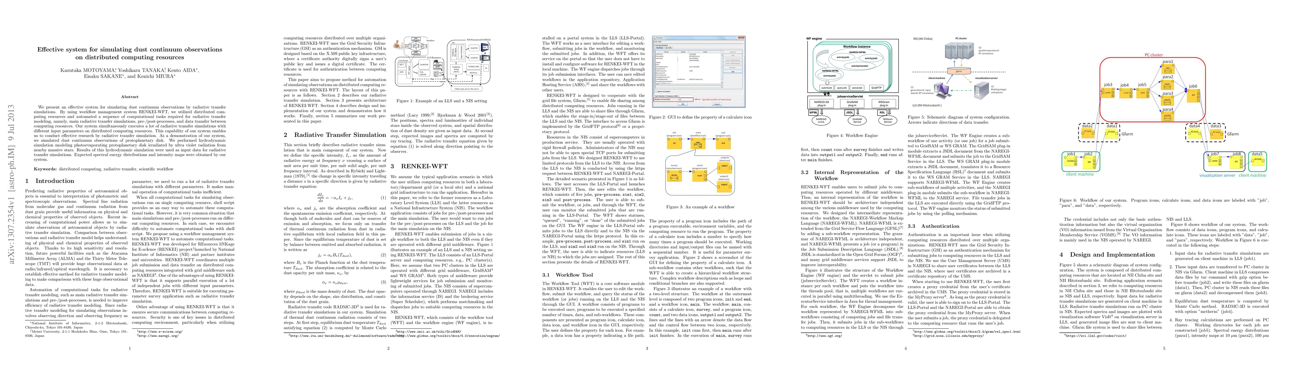 We present an effective system for simulating dust continuum observations by radiative transfer simulations. By using workflow management system RENKEI-WFT, we utilized distributed computing resources and automated a sequence of computational tasks required for radiative transfer modeling, namely, main radiative transfer simulations, pre-/post-processes, and data transfer between computing resources. Our system simultaneously executes a lot of radiative transfer simulations with different input parameters on distributed computing resources. This capability of our system enables us to conduct effective research by radiative transfer simulation. As a demonstration of our system, we simulated dust continuum observations of protoplanetary disk. We performed hydrodynamic simulation modeling photoevaporating protoplanetary disk irradiated by ultra violet radiation from nearby massive stars. Results of this hydrodynamic simulation were used as input data for radiative transfer simulations. Expected spectral energy distributions and intensity maps were obtained by our system.