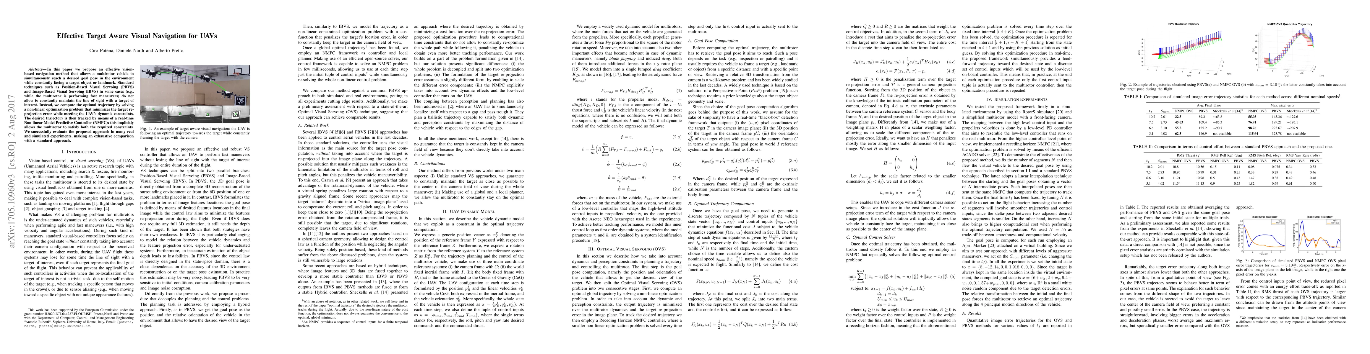 In this paper we propose an effective vision-based navigation method that allows a multirotor vehicle to simultaneously reach a desired goal pose in the environment while constantly facing a target object or landmark. Standard techniques such as Position-Based Visual Servoing (PBVS) and Image-Based Visual Servoing (IBVS) in some cases (e.g., while the multirotor is performing fast maneuvers) do not allow to constantly maintain the line of sight with a target of interest. Instead, we compute the optimal trajectory by solving a non-linear optimization problem that minimizes the target re-projection error while meeting the UAV's dynamic constraints. The desired trajectory is then tracked by means of a real-time Non-linear Model Predictive Controller (NMPC): this implicitly allows the multirotor to satisfy both the required constraints. We successfully evaluate the proposed approach in many real and simulated experiments, making an exhaustive comparison with a standard approach.